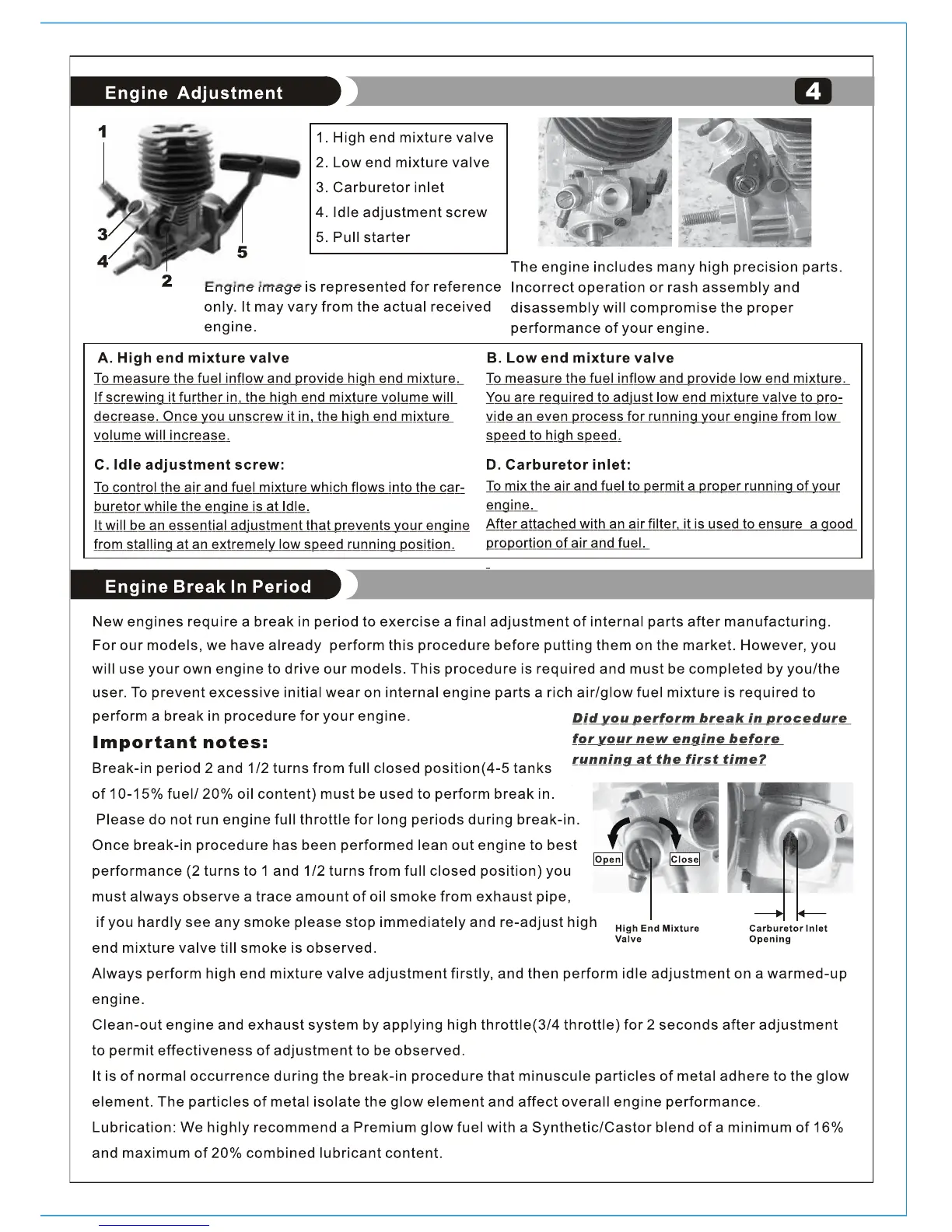 HBX WildFire 3378 - Engine Adjustment; High end mixture valve; Low end mixture valve; Idle adjustment screw