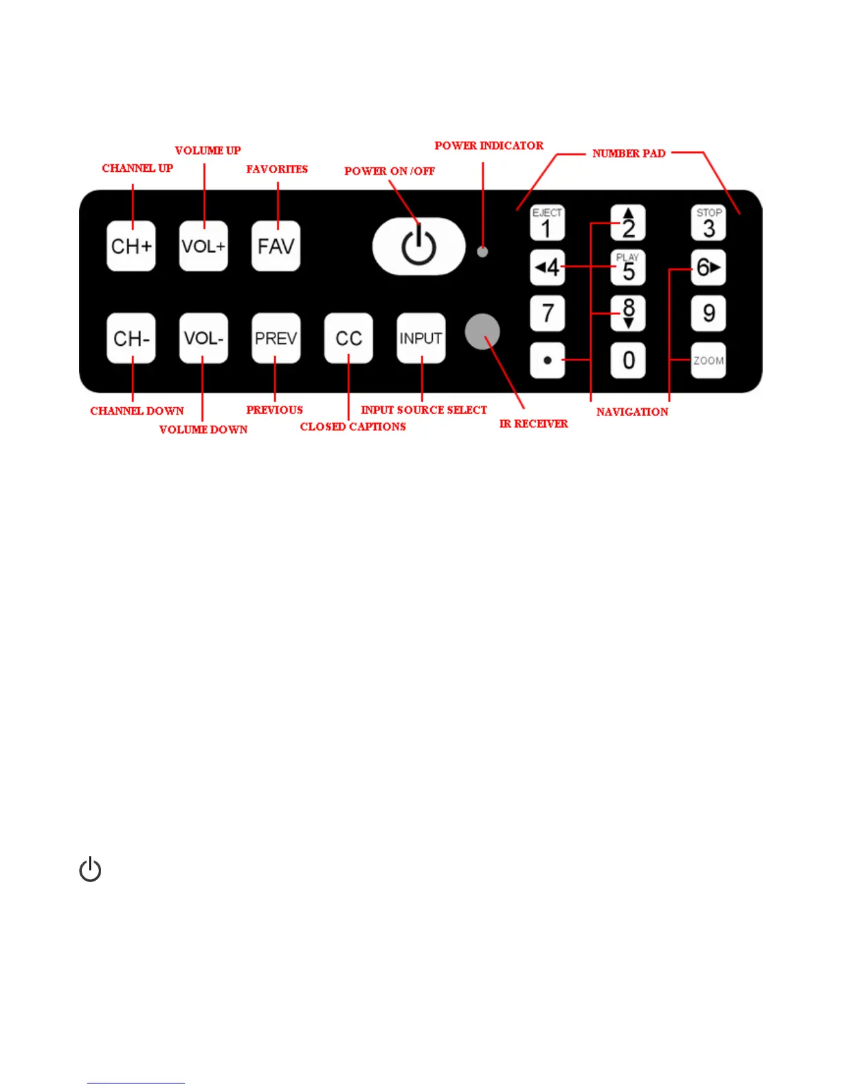 Goes to the next lower programmed channel. If TV is on the