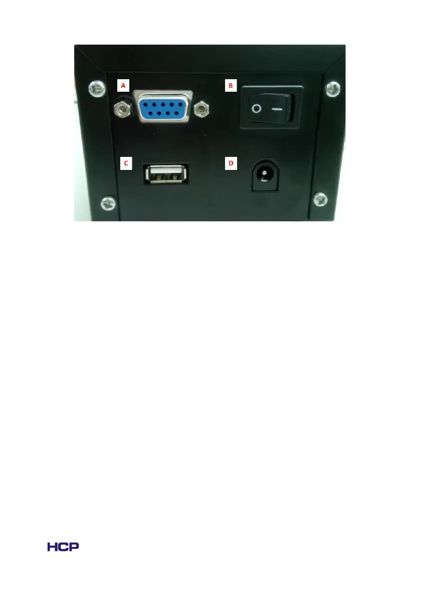 oven, B: ON/OFF power switch, C: Connection port to PC; D: Connection port to