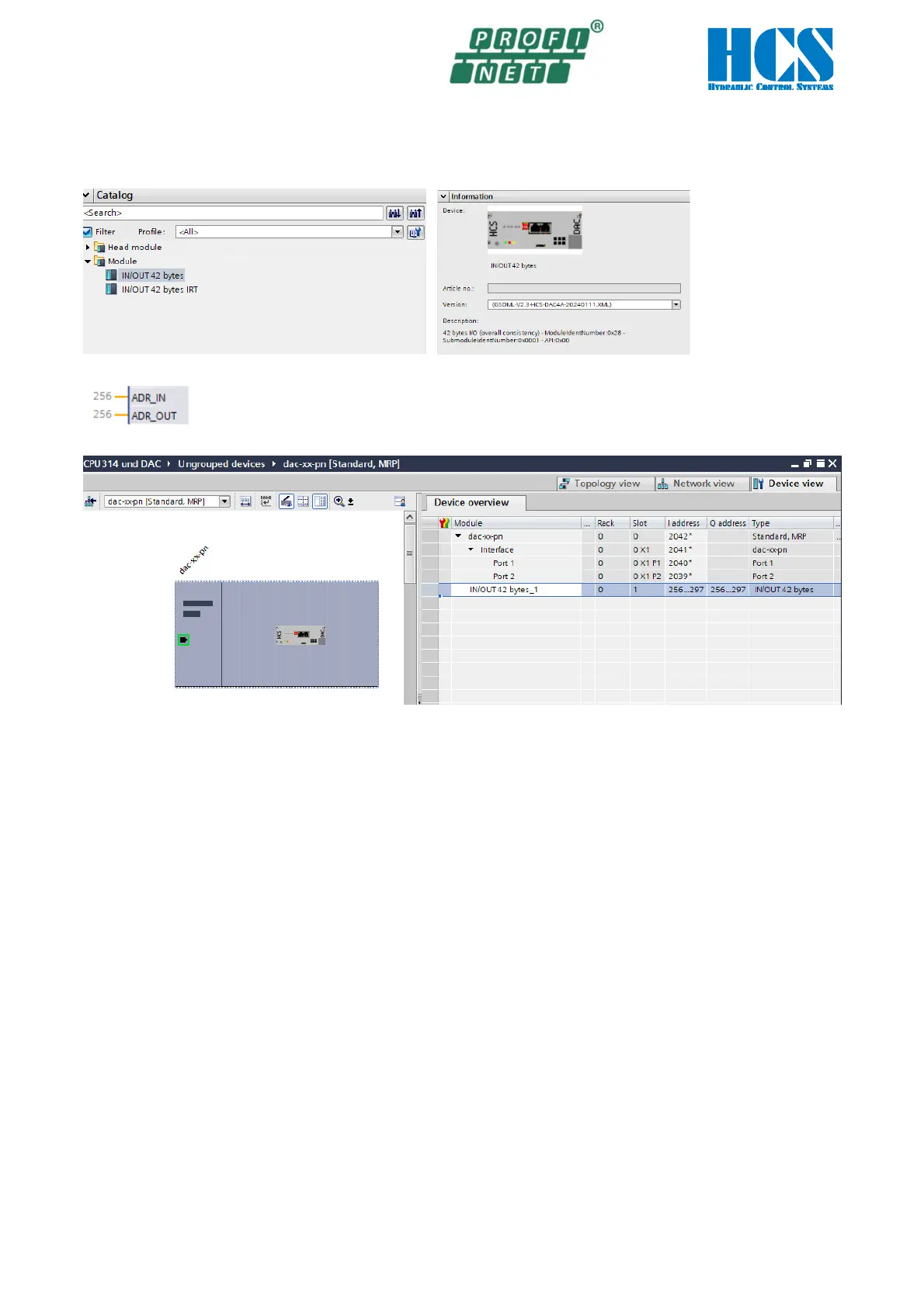 Unlike the CPU 1200, 1500, the E-address and A-address must be assigned to the variables #ADR_IN and #ADR_OUT