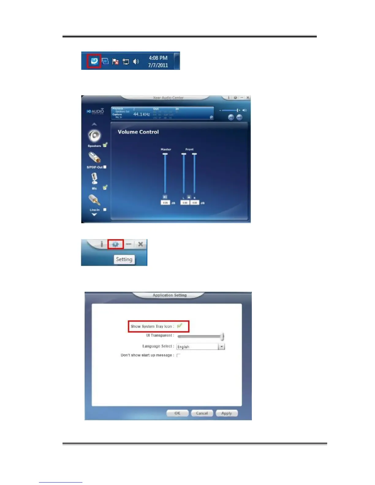 HD Audio AS372 - System Tray Icon Management; Showing the Xear Audio Center Tray Icon