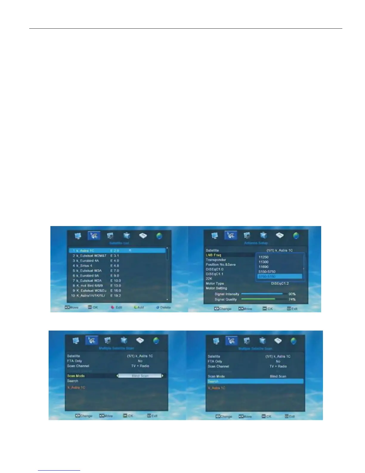 satellite search, user need to set DiSEqC/USALS in Antenna setup first)