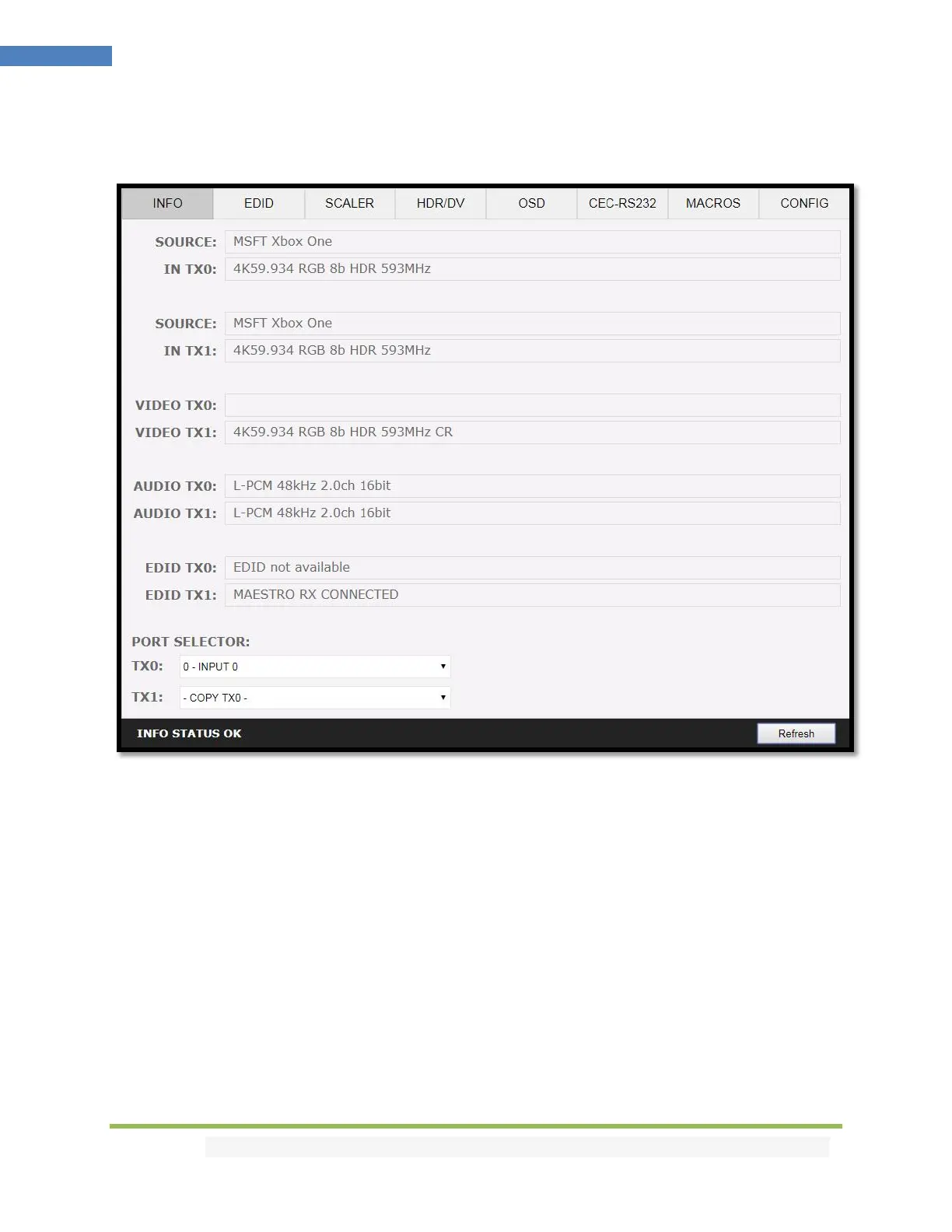 EDID TX0/TX1: Display the EDID max capabilities of any connected sink at TX0 or TX1 output.