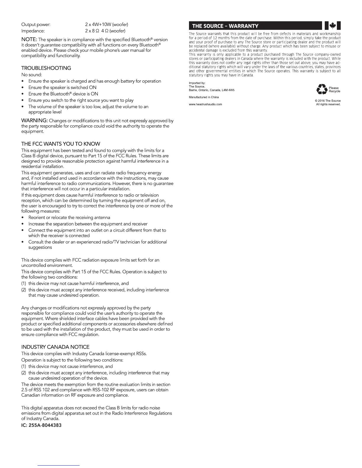 HEADRUSH 8044383 - Troubleshooting; No Sound Issues; Regulatory Compliance; FCC Compliance Information