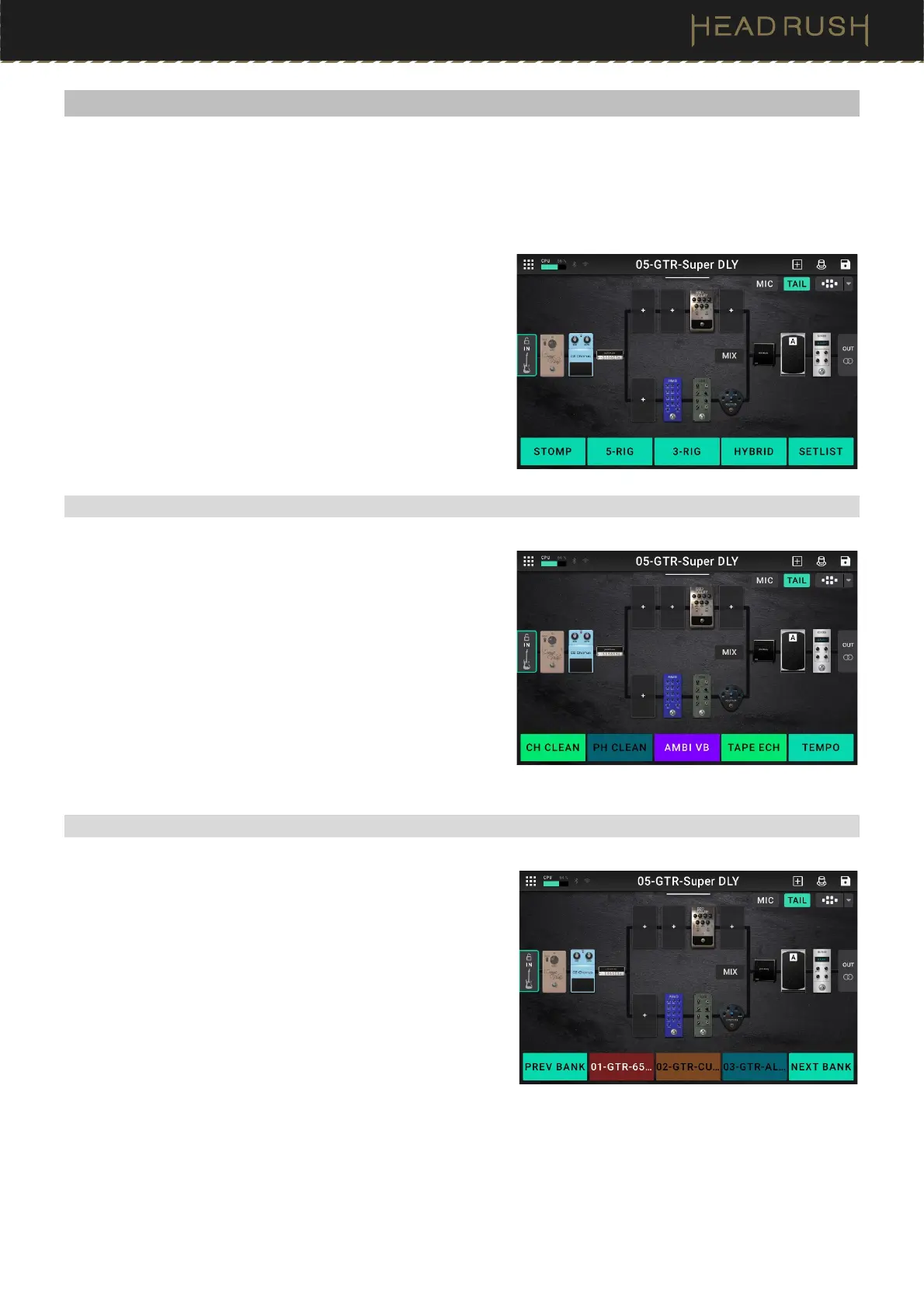 In 3-Rig Mode, the middle three footswitches correspond to rigs