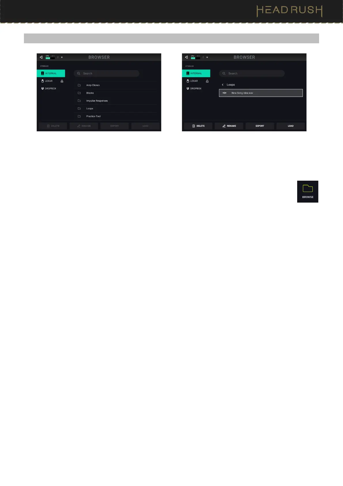 The File Browser is a handy tool for navigating your files and folders on HeadRush Core’s internal storage. In