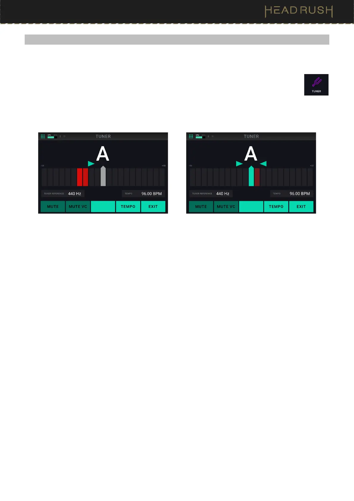 To access HeadRush Core’s built-in guitar tuner, press and hold footswitch 5 (labeled “—TUNER/TALK”).