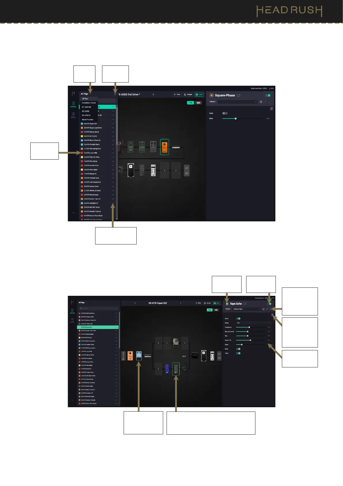 When the Rig List is opened on the left side of the screen, you can browse and edit rigs in your setlists.