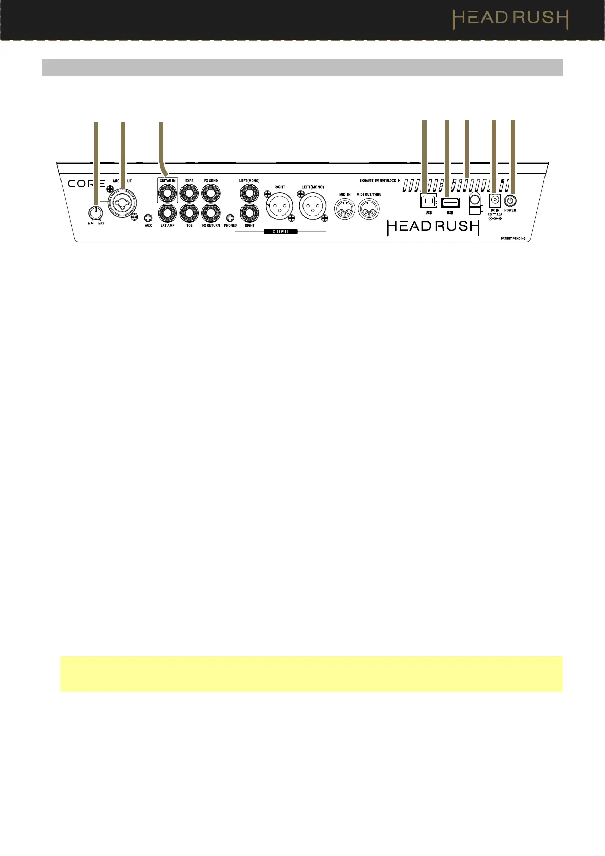 Connect this USB port to a computer using a standard USB cable. This connection allows HeadRush Core to send