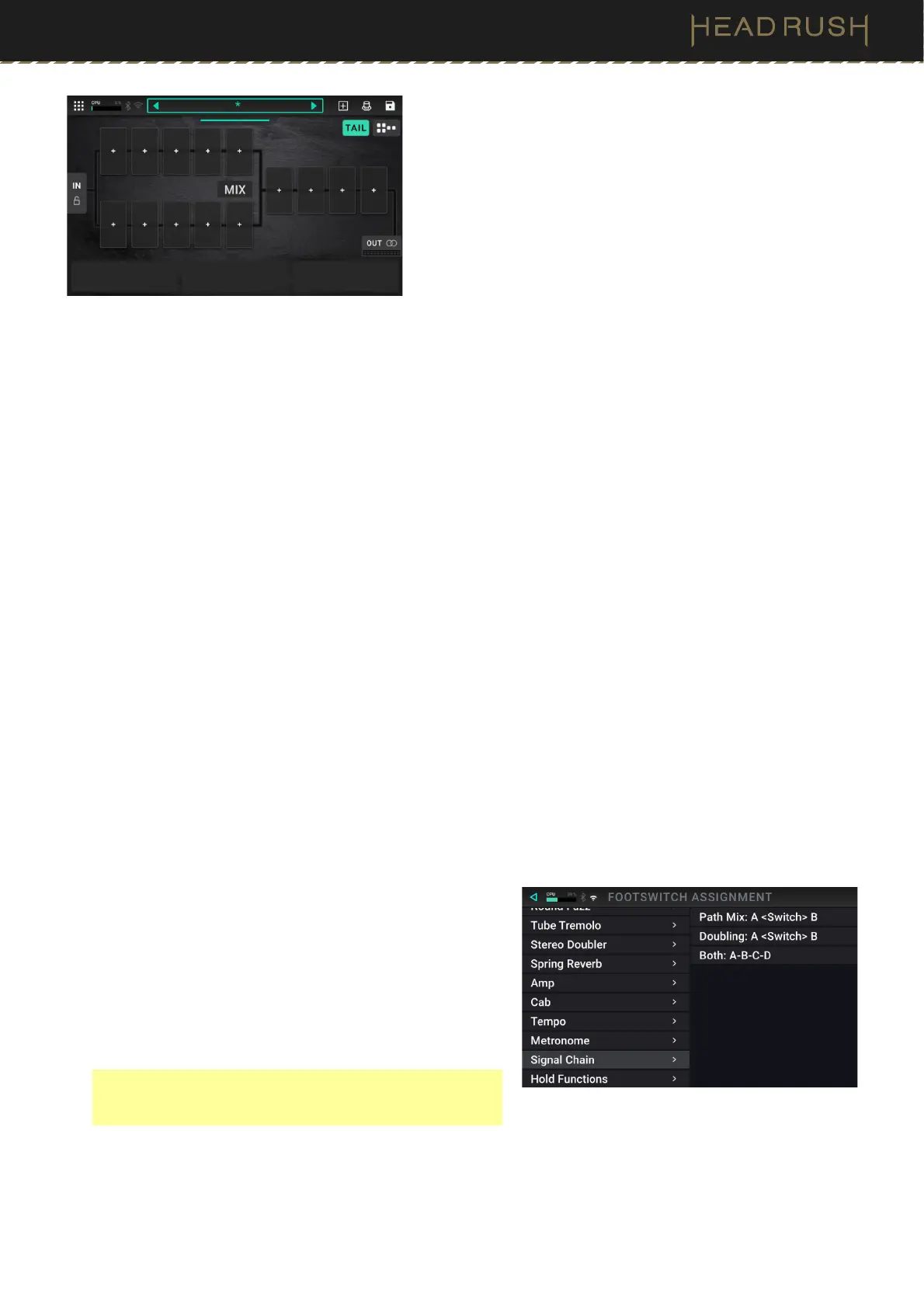 When using split path signal chains, you can use a footswitch or expression pedal to toggle or blend between each