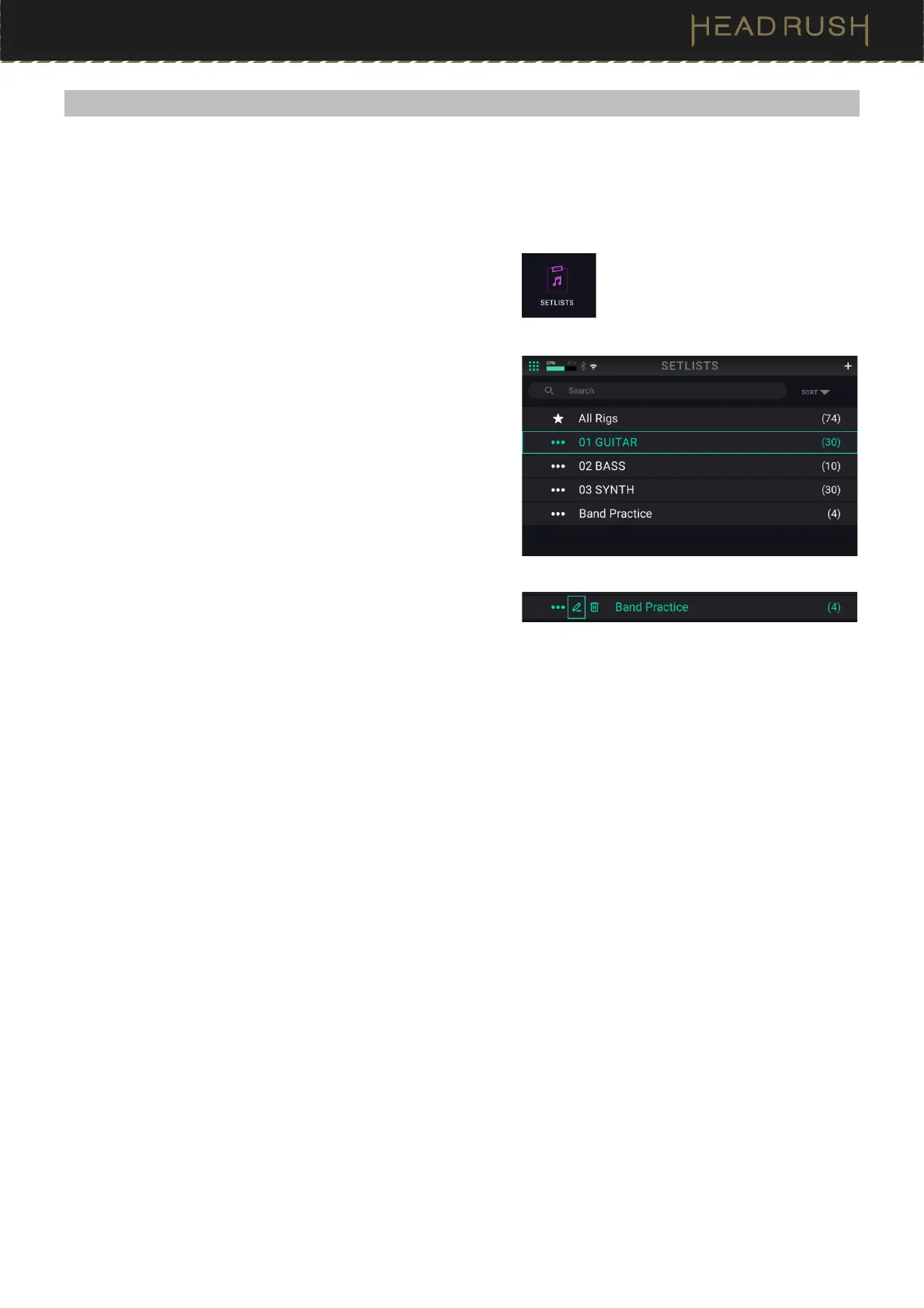 A setlist is a saved collection of songs and rigs arranged in a customized order. After being edited and saved, setlists