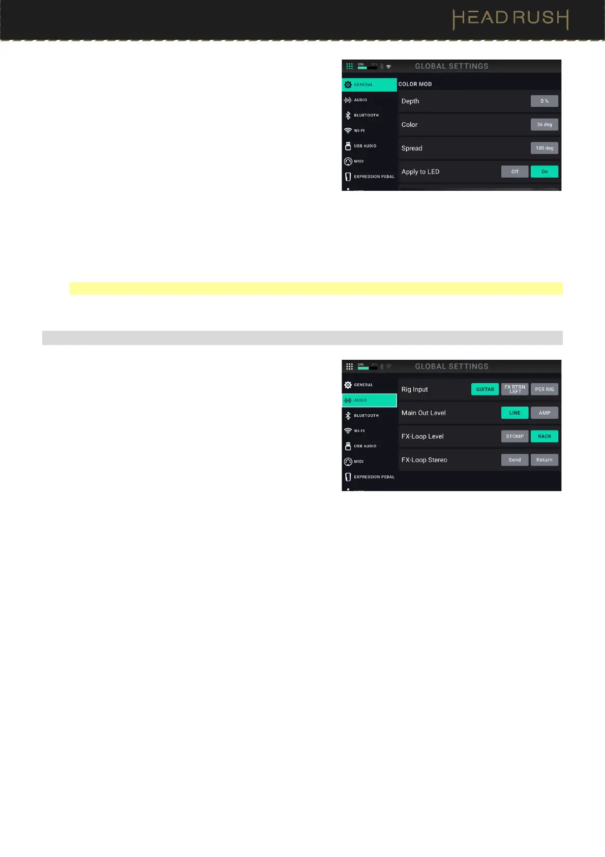 FX-Loop Stereo: These settings determine whether the incoming and outgoing signal in the effects loop is stereo