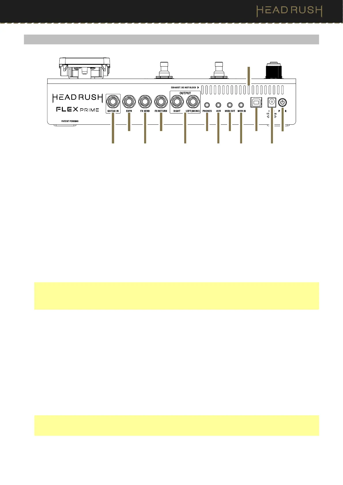 Important: The audio signal from the aux input is routed directly to the outputs of HeadRush Flex Prime without