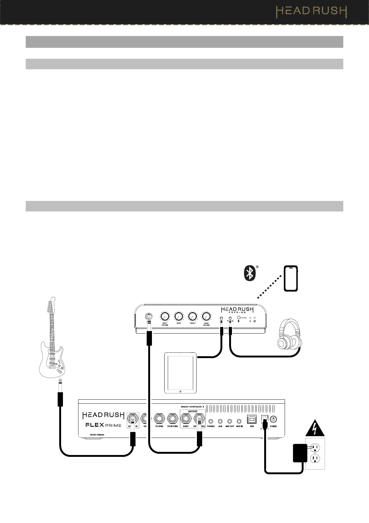 3. Connect audio output devices (headphones, amp modeling pedal, etc.) to FRFR-GO. To avoid unwanted distortion,