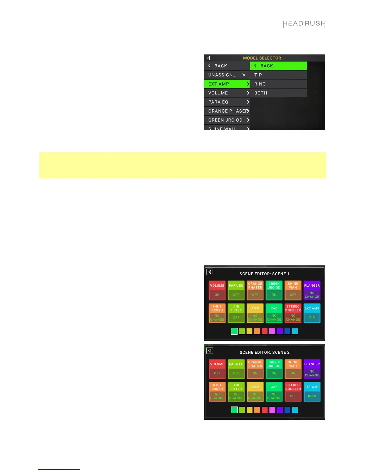 The Scene feature allows you to turn multiple models on or off in each rig. When you press the footswitch