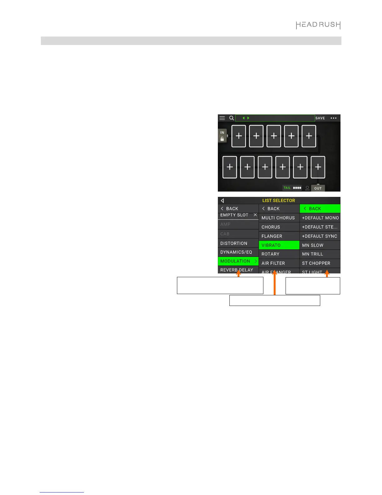 seleccionados y hasta las salidas de la HeadRush Gigboard. Puede utilizar la pantalla táctil para acomodar sus