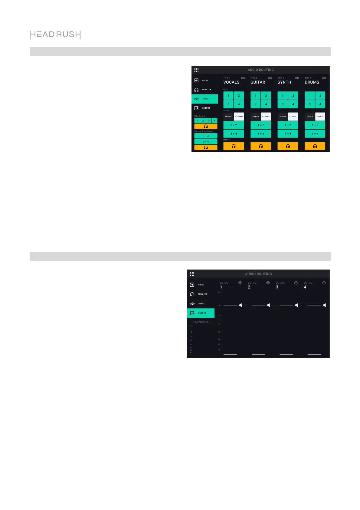 To select routing for the stereo backing track, tap the 1+2 or 3+4 buttons under Backing Track