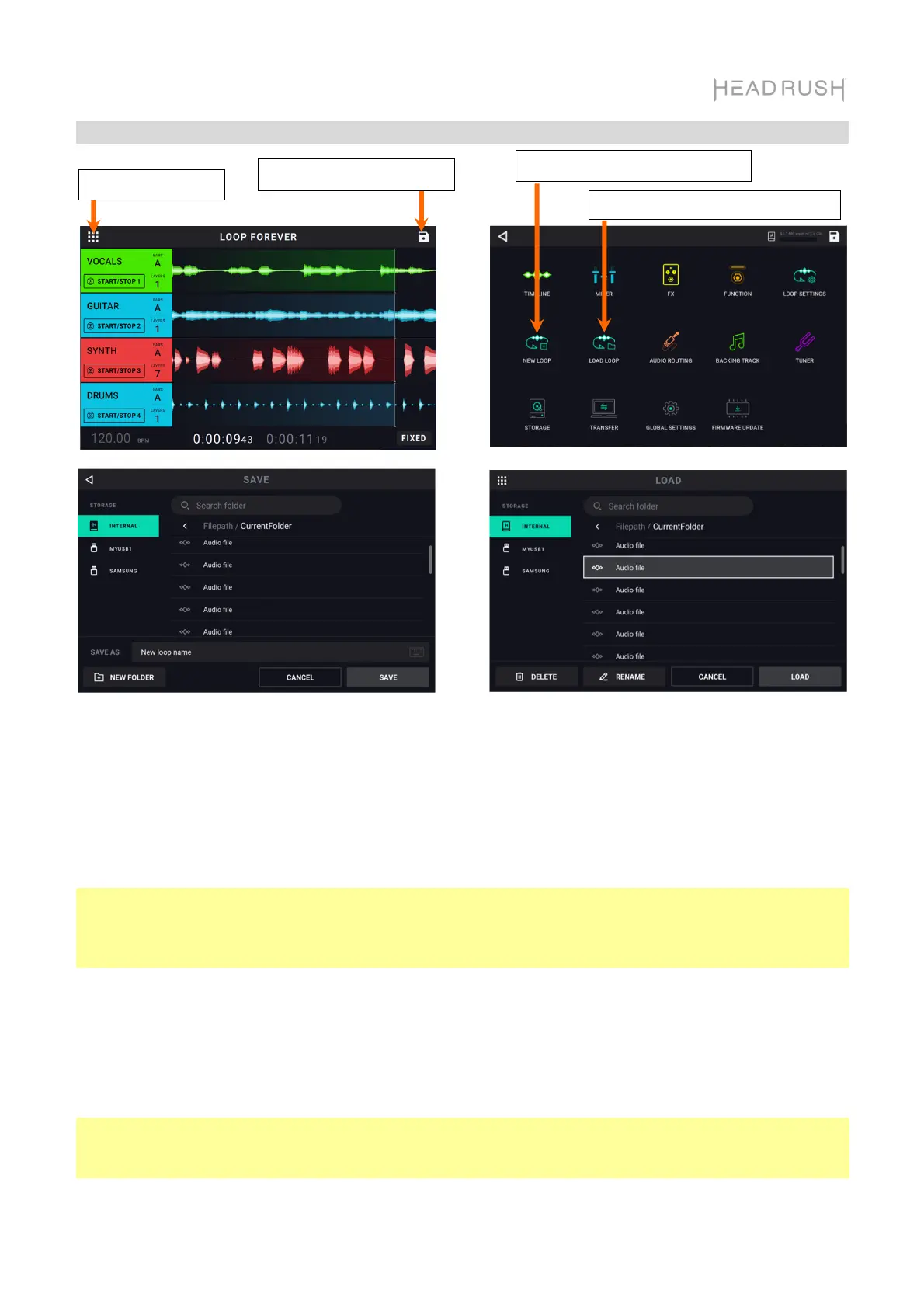 Para cargar un bucle previamente guardado, toque el icono del menú de navegación y luego