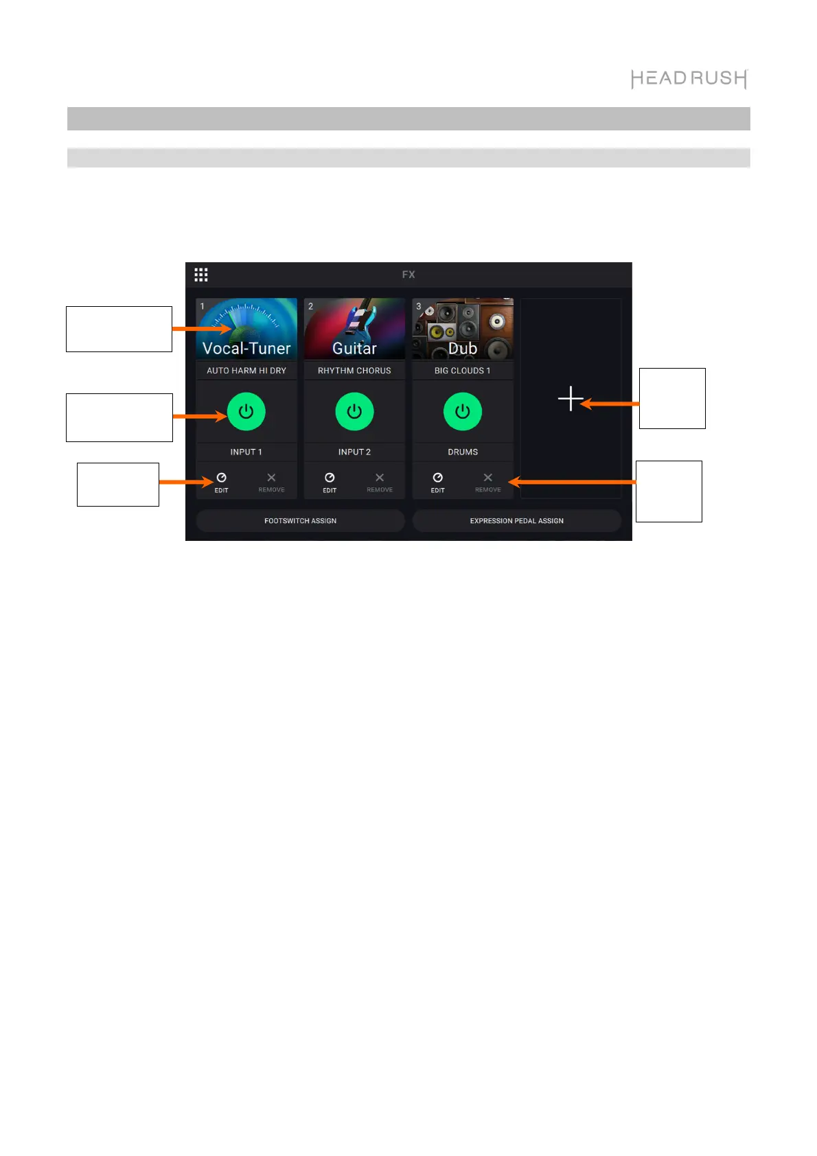 Pour accéder à la page des effets, appuyez sur le commutateur au pied FX ou sur Navigation Menu