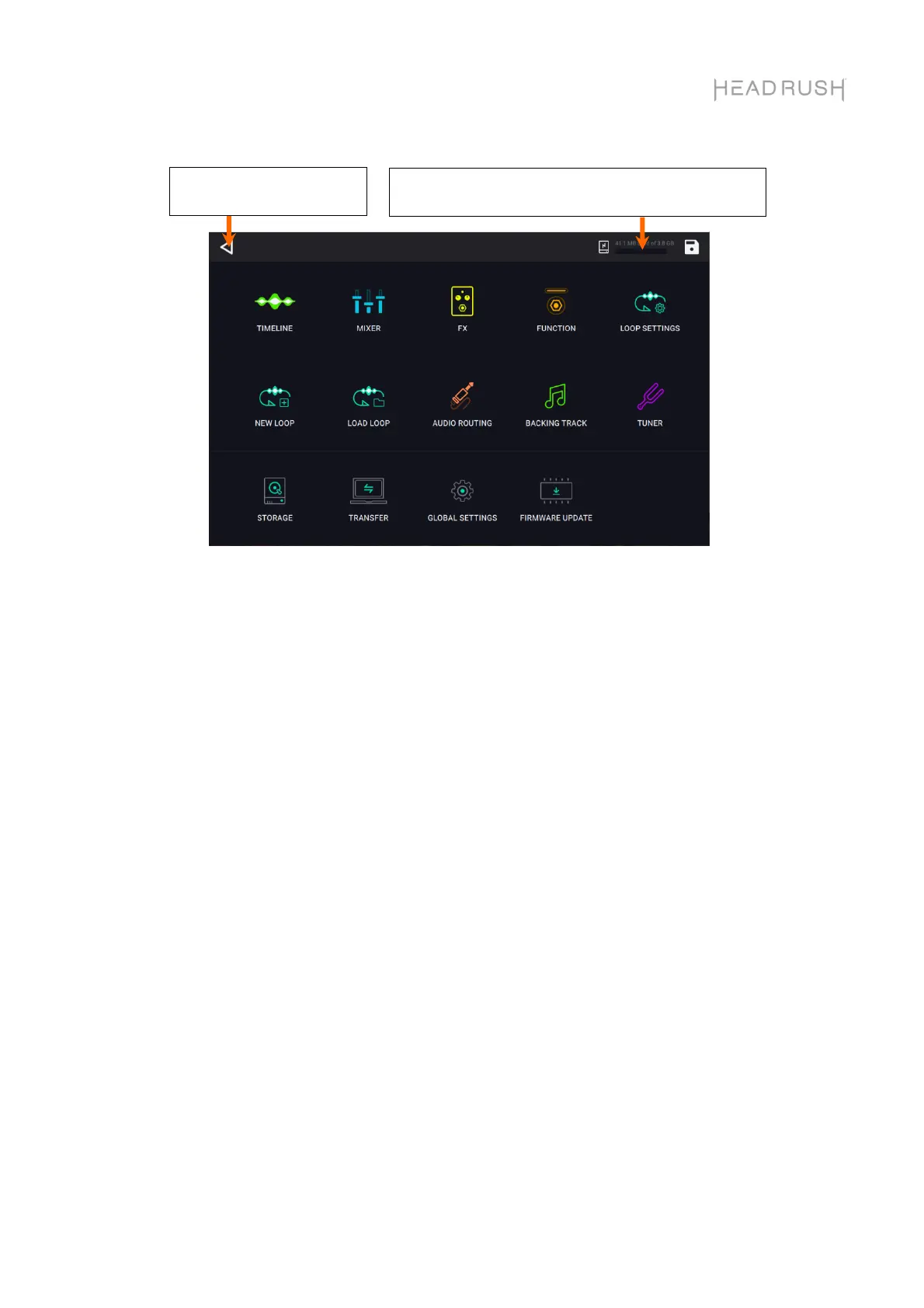 • Timeline: Toccare qui per accedere alla vista timeline performance dell’HeadRush Looperboard.
