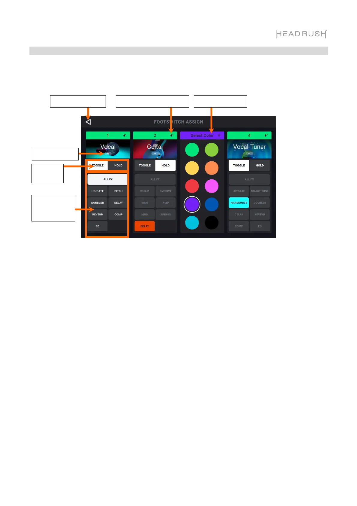 On the Footswitch Assign page, you can modify the functions of HeadRush Looperboard's