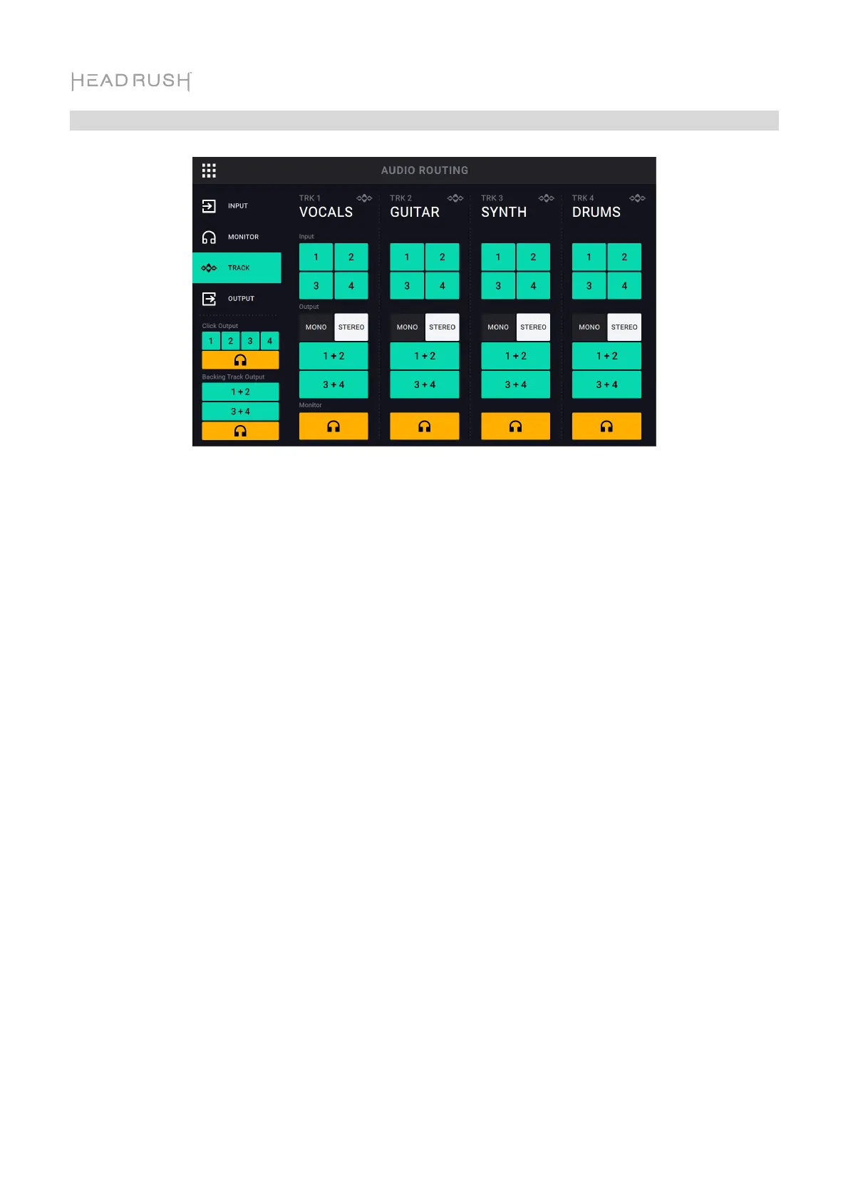 To select routing for the stereo backing track, tap the 1+2 or 3+4 buttons under Backing Track