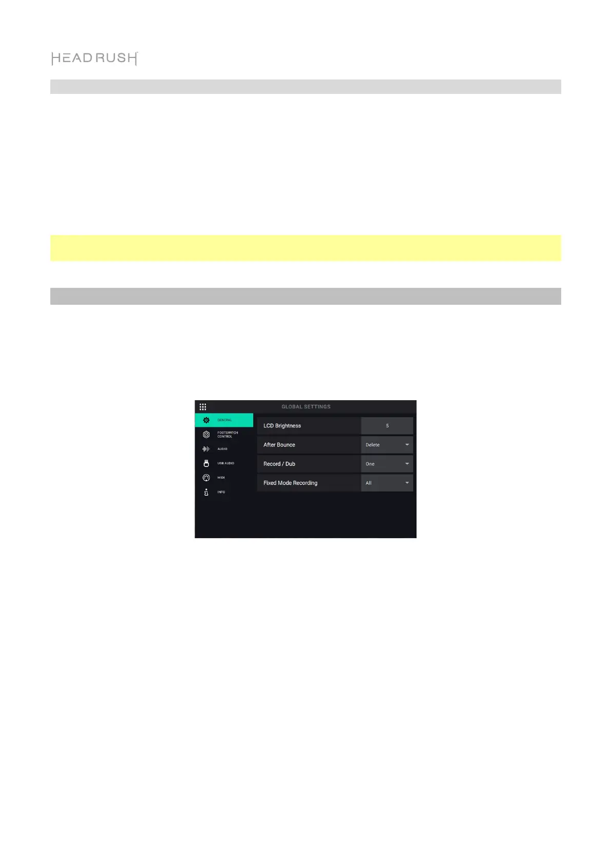 Use the Global Settings page to configure HeadRush Looperboard’s overall settings, including