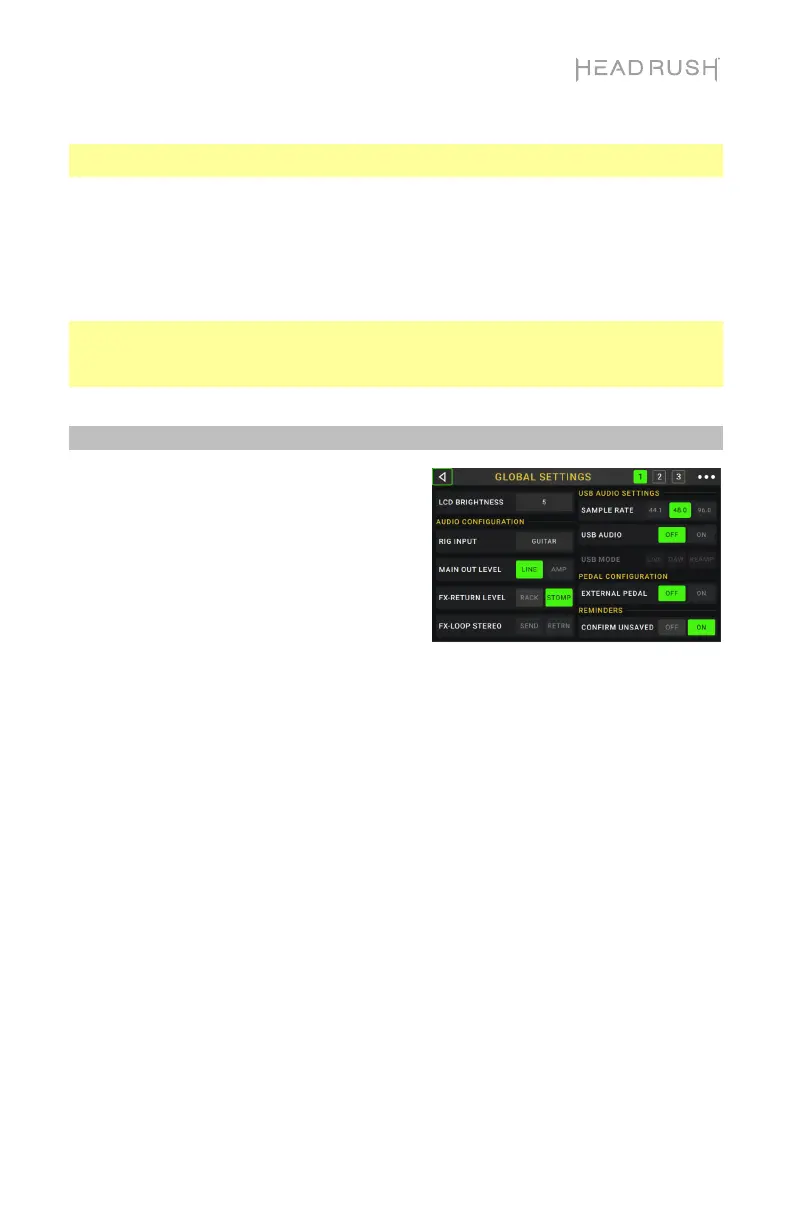 HeadRush MX5. Lorsque ce paramètre est réglé sur Stomp, le niveau de sortie est de +6 dBu.