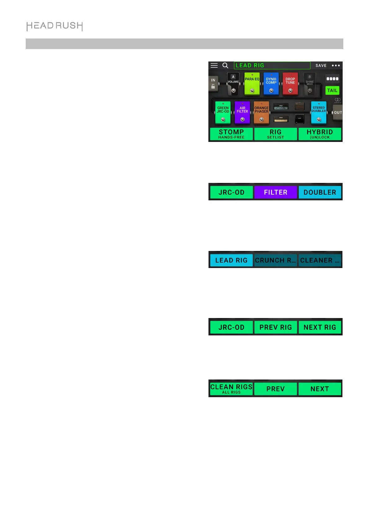 Footswitches 1-3 correspond to rigs you have previously saved.