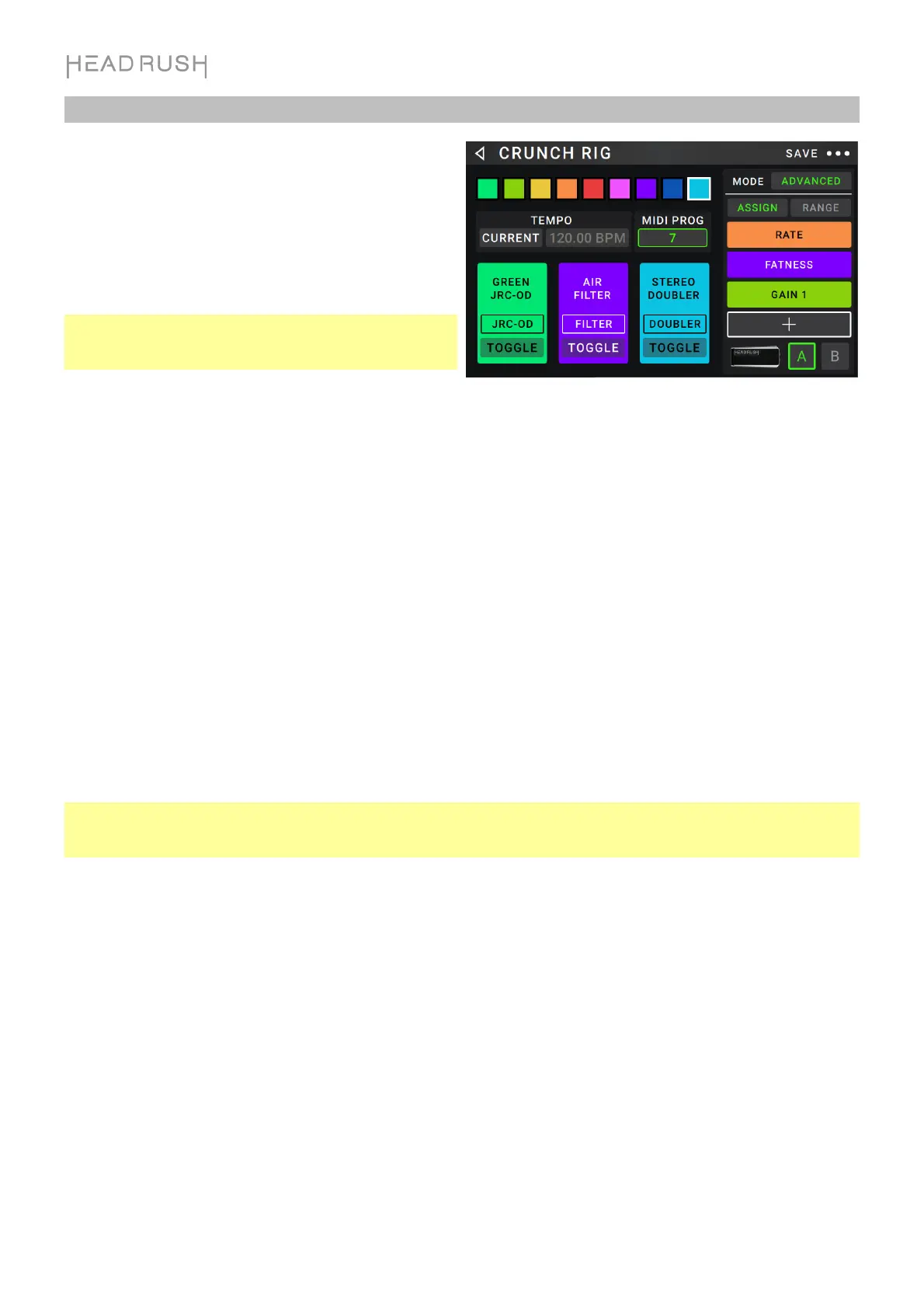 color of the corresponding footswitch indicator when the HeadRush MX5 is in Rig Mode.