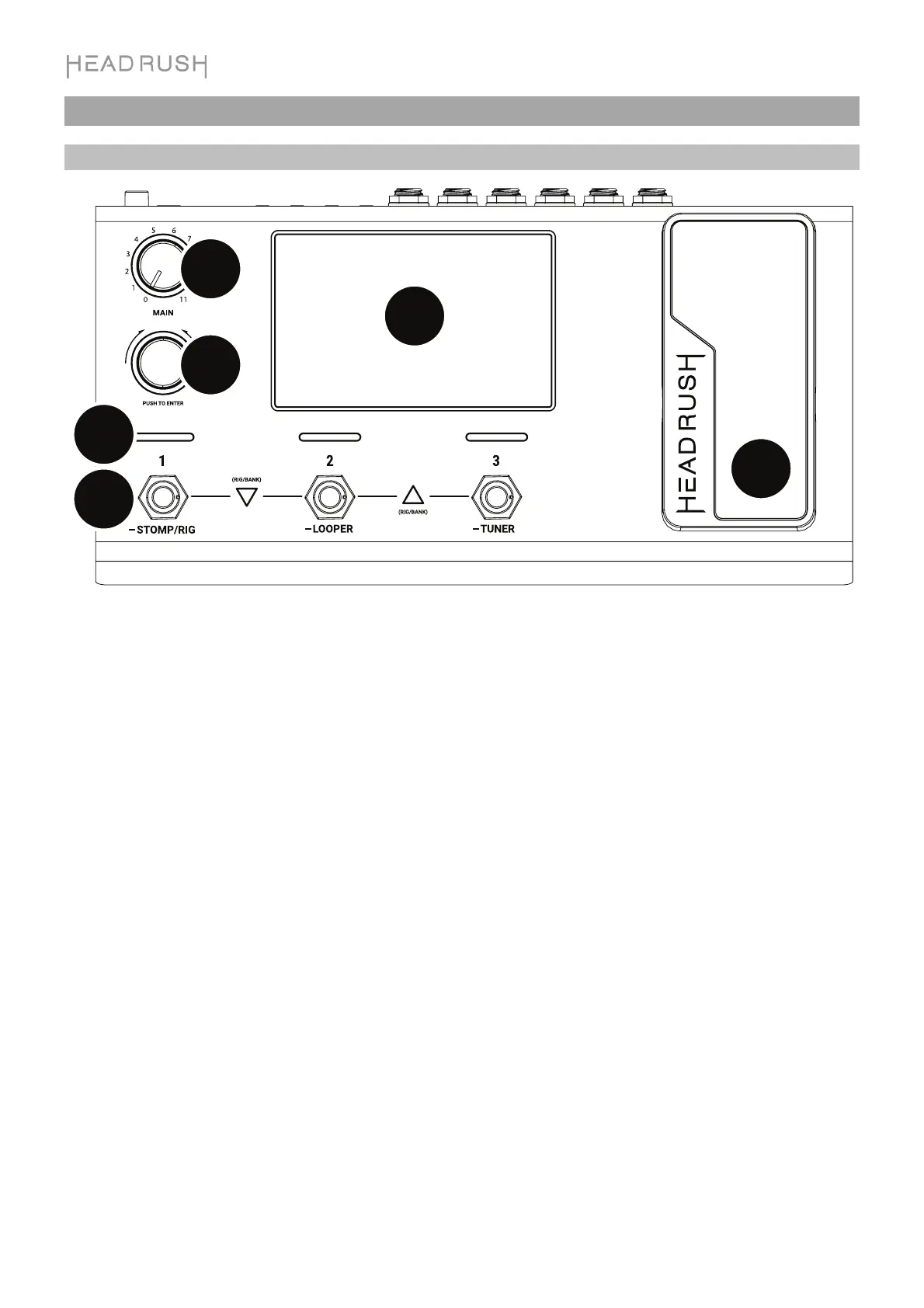 1. Display: This full-color multi-touch display shows information relevant to HeadRush MX5’s current operation.