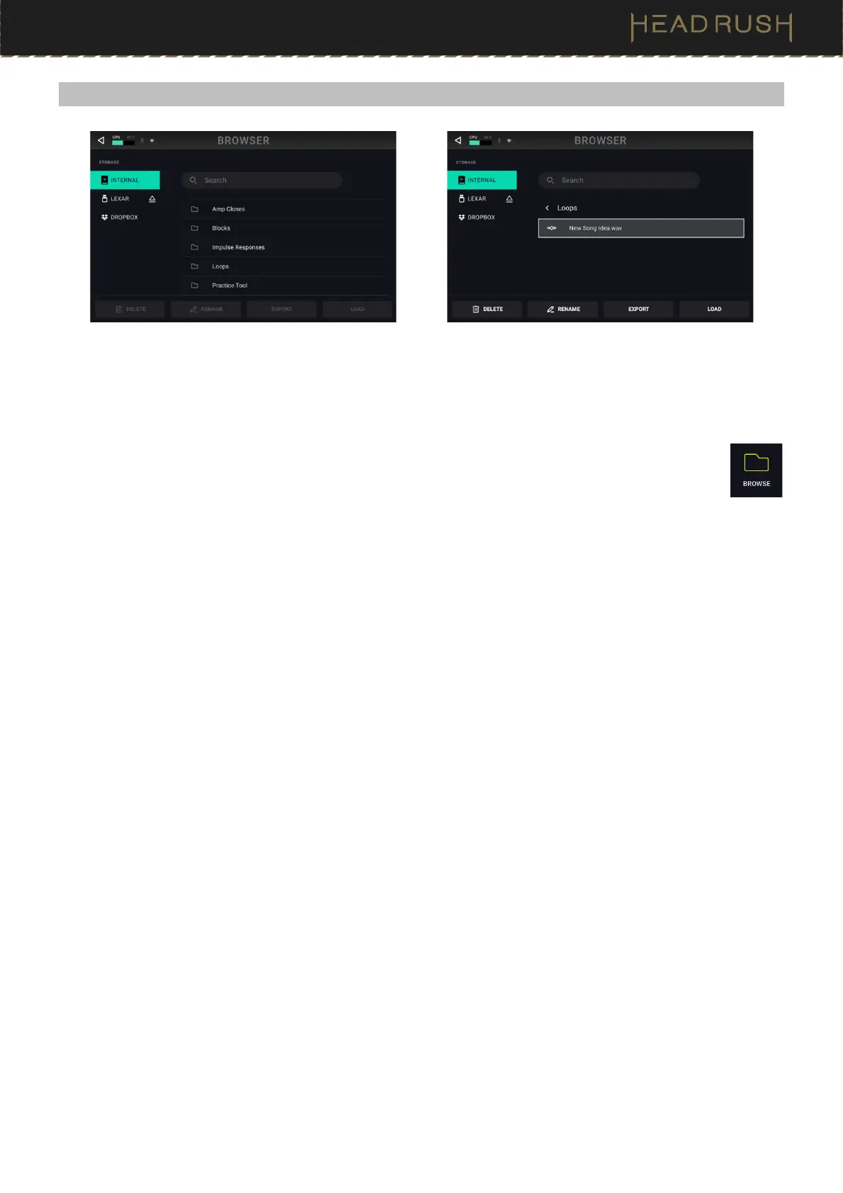 The File Browser is a handy tool for navigating your files and folders on HeadRush Prime’s internal storage. In