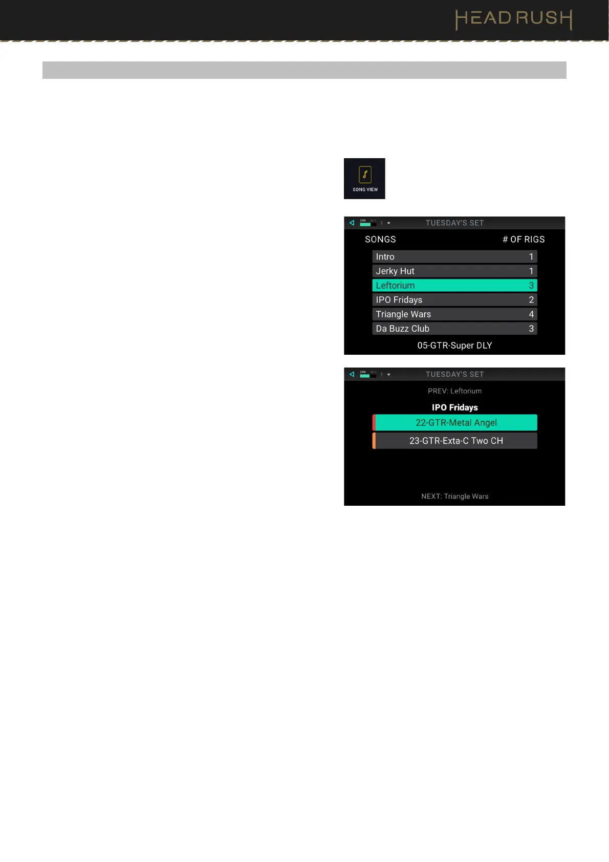 When using a setlist, you can choose to view your current rig selection as well as your position within the setlist on