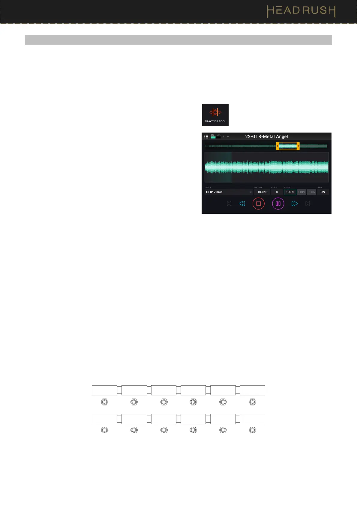 When the Practice Tool is in use, the following will be shown on HeadRush Prime’s footswitch OLED screens: