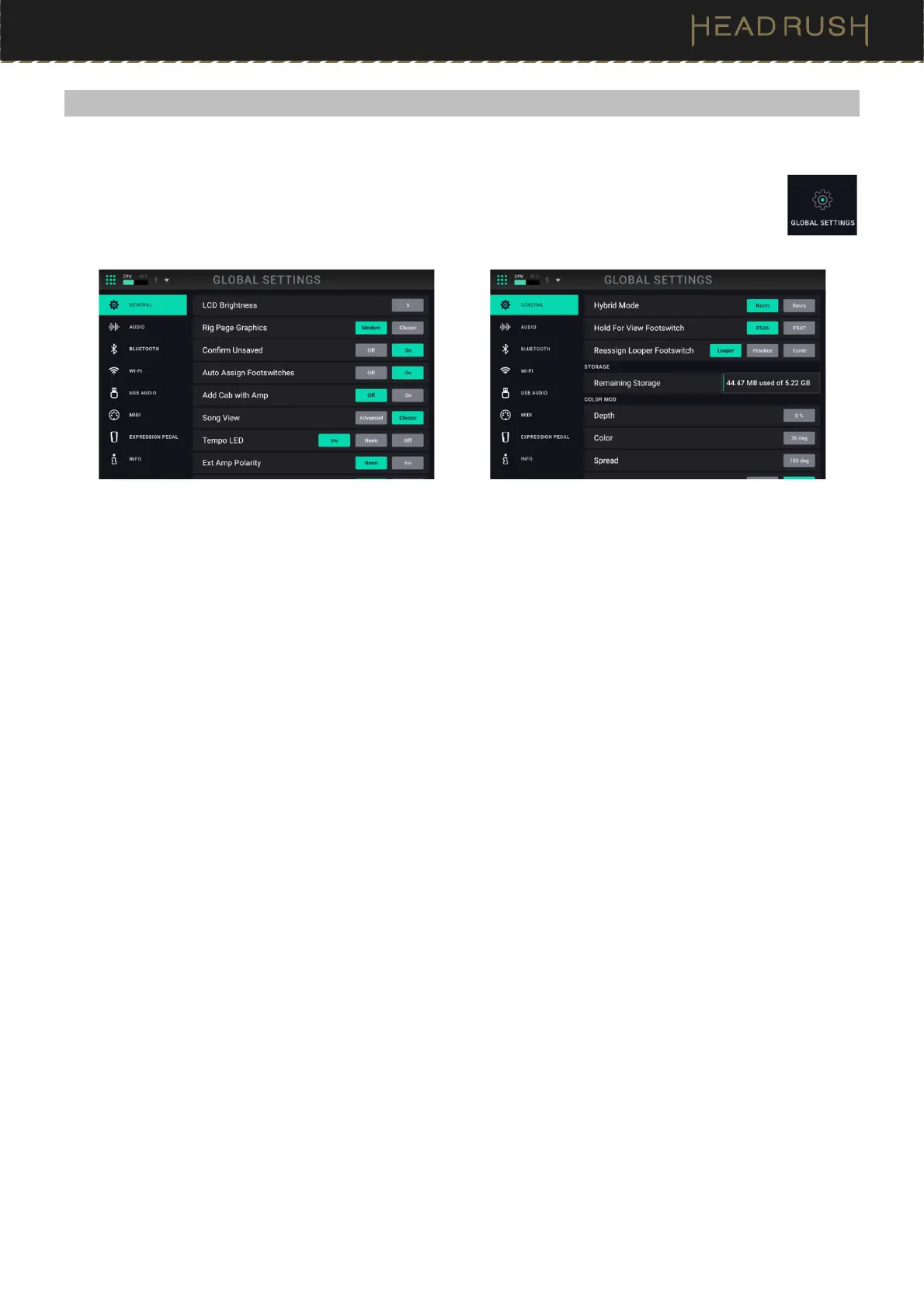 Use the global settings to configure HeadRush Prime’s overall operation.