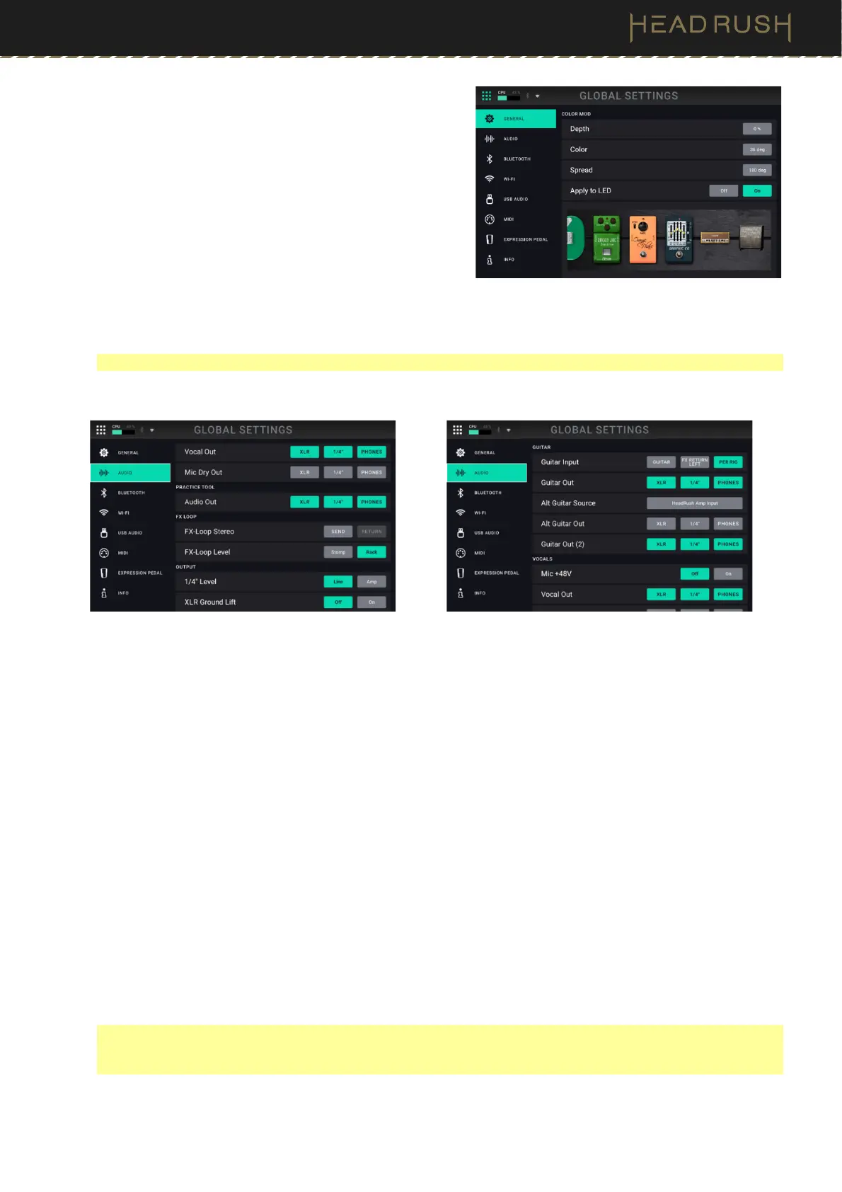 to send the signal to HeadRush Prime’s XLR outputs, 1/4” to send the signal to the 1/4” outputs, and Phones
