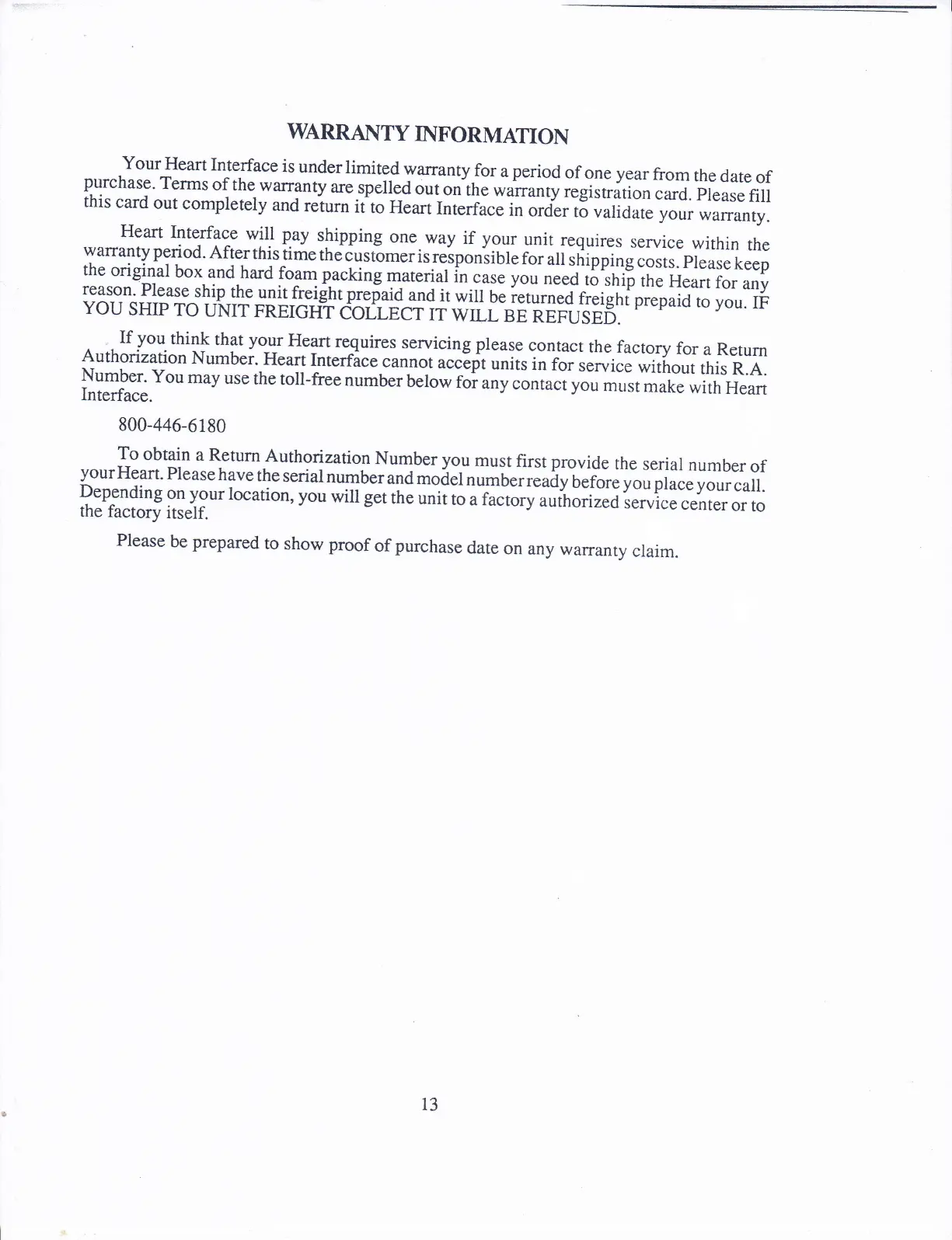 Heart Interface HF12-1200 - Warranty