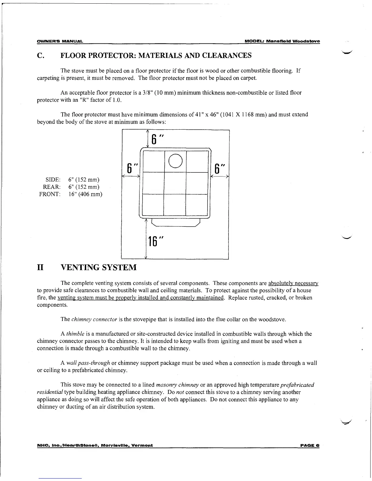 HearthStone Mansfield - Floor Protector: Materials and Clearances; Venting System