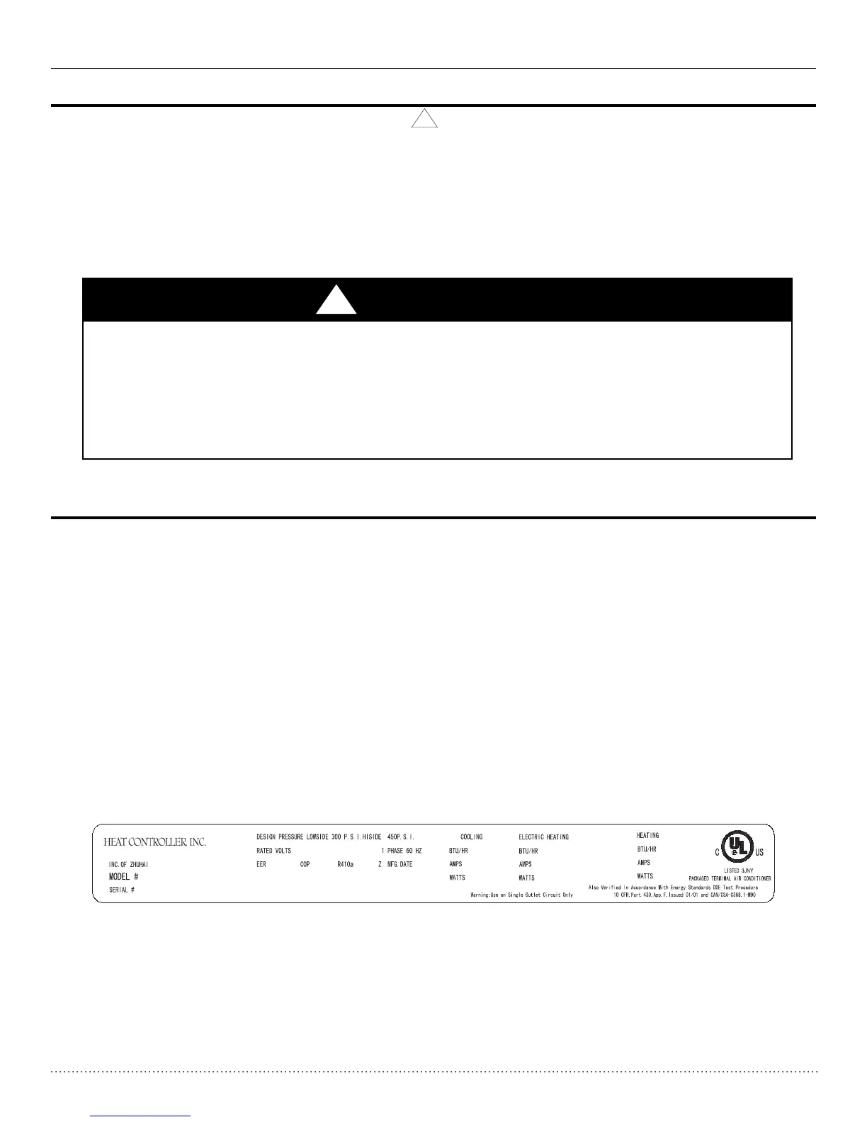 Heat Controller, Inc. OWNER’S MANUAL Packaged Terminal A/C