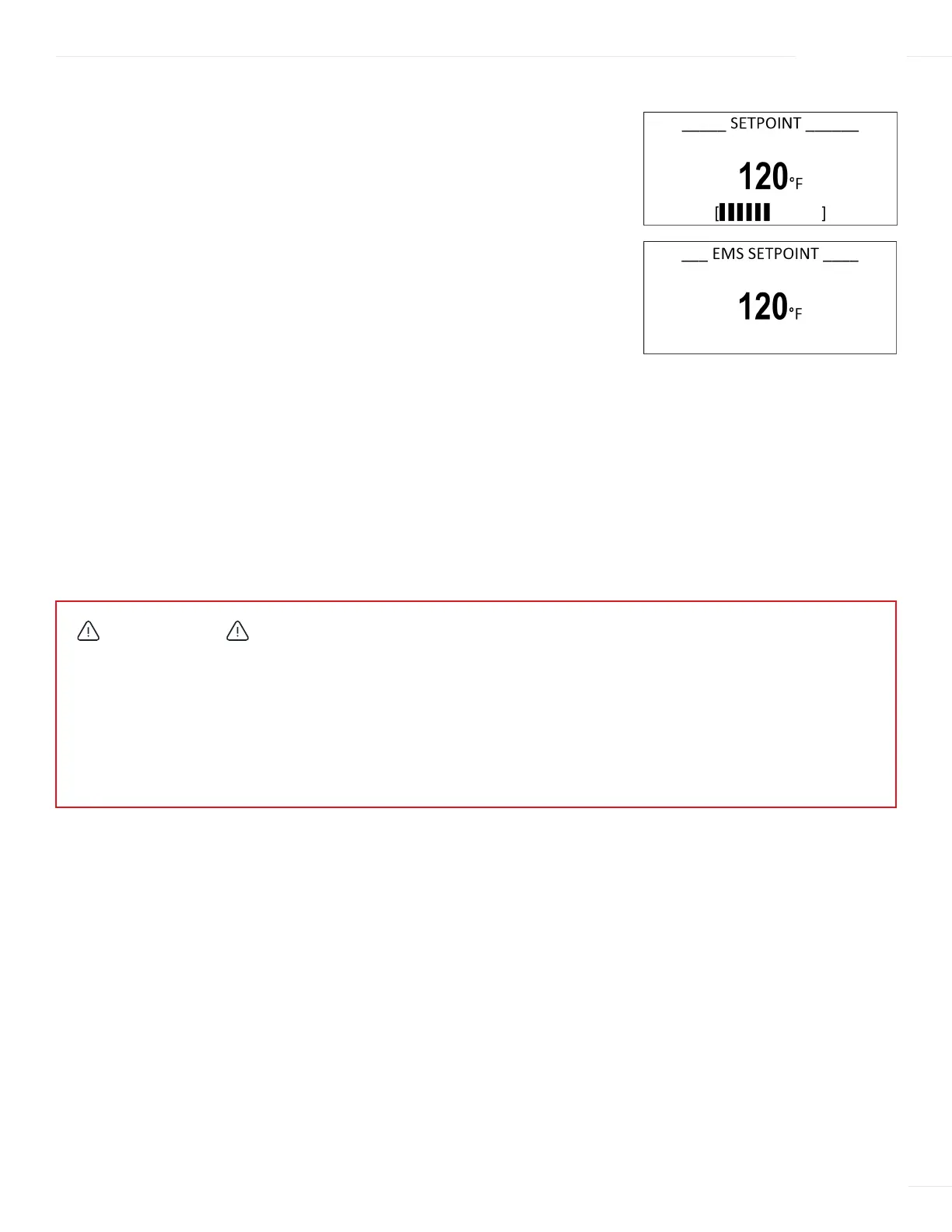 If the Setpoint is set to a value higher than 125°F (52°C), a scald warning