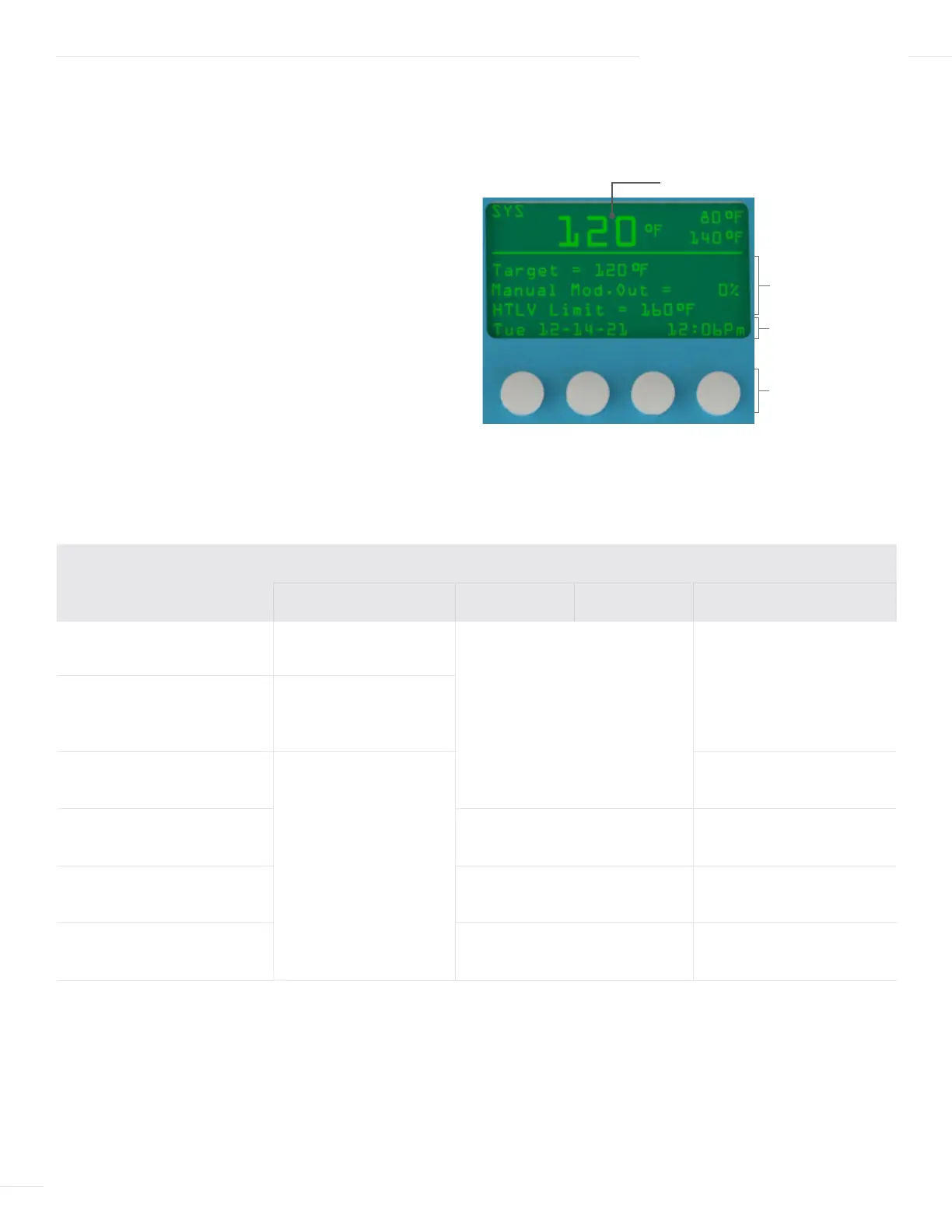 The display button functions vary based on the current screen displayed, as described in the following table: