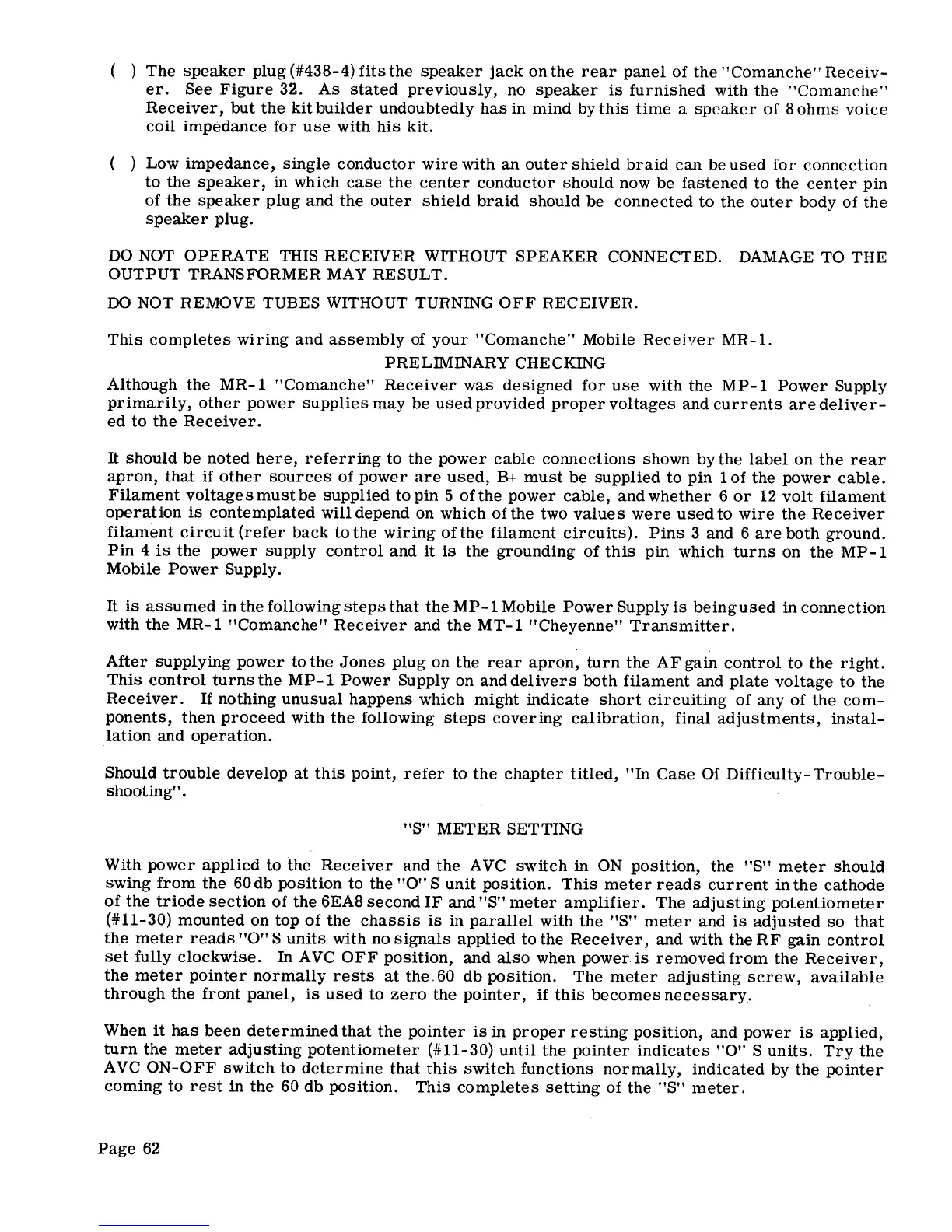 Heathkit Comanche MR-1 - PRELIMINARY CHECKING; S METER SETTING