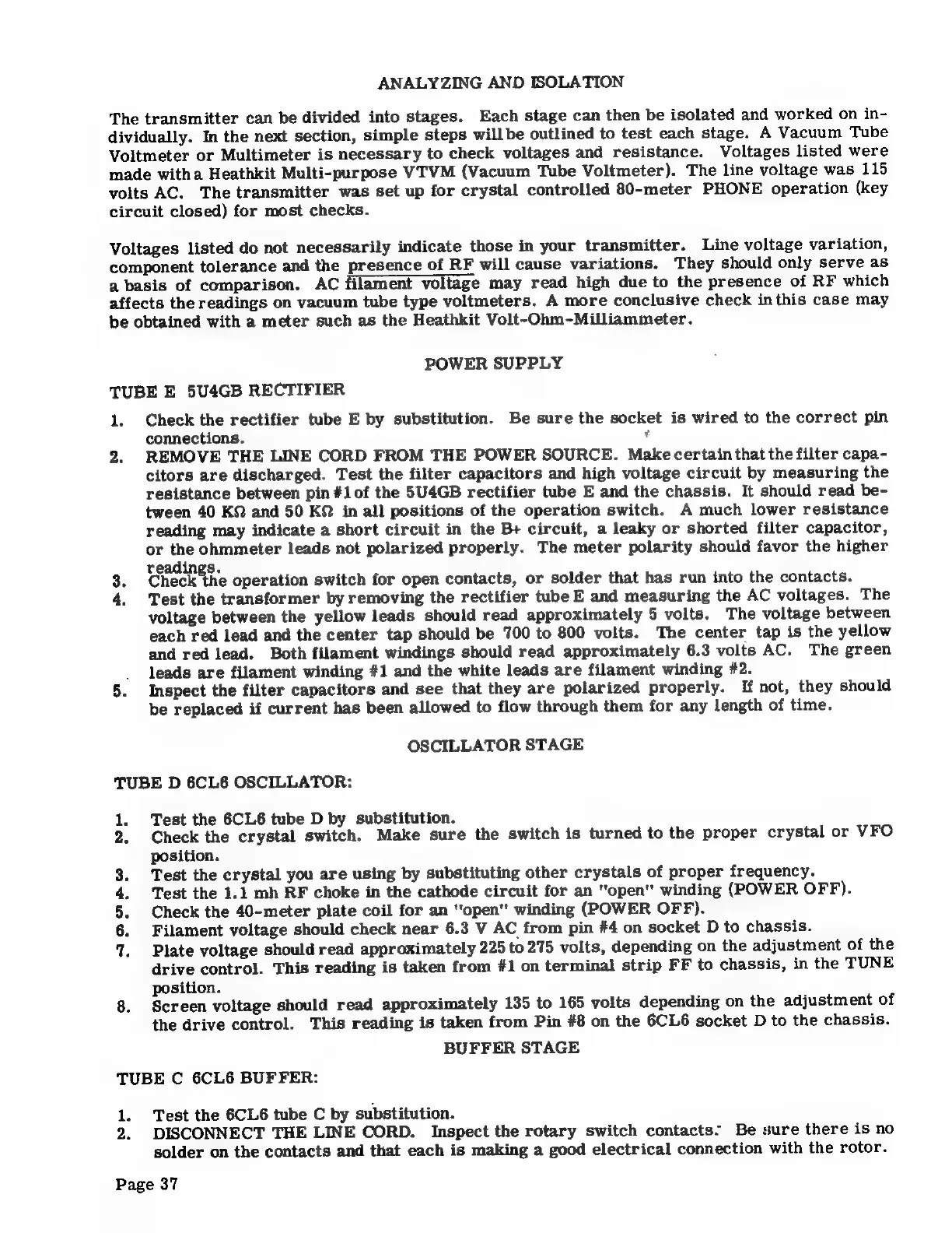 Heathkit DX-40 - ANALYZING AND ISOLATION; Power Supply Troubleshooting; Oscillator and Buffer Stage Checks