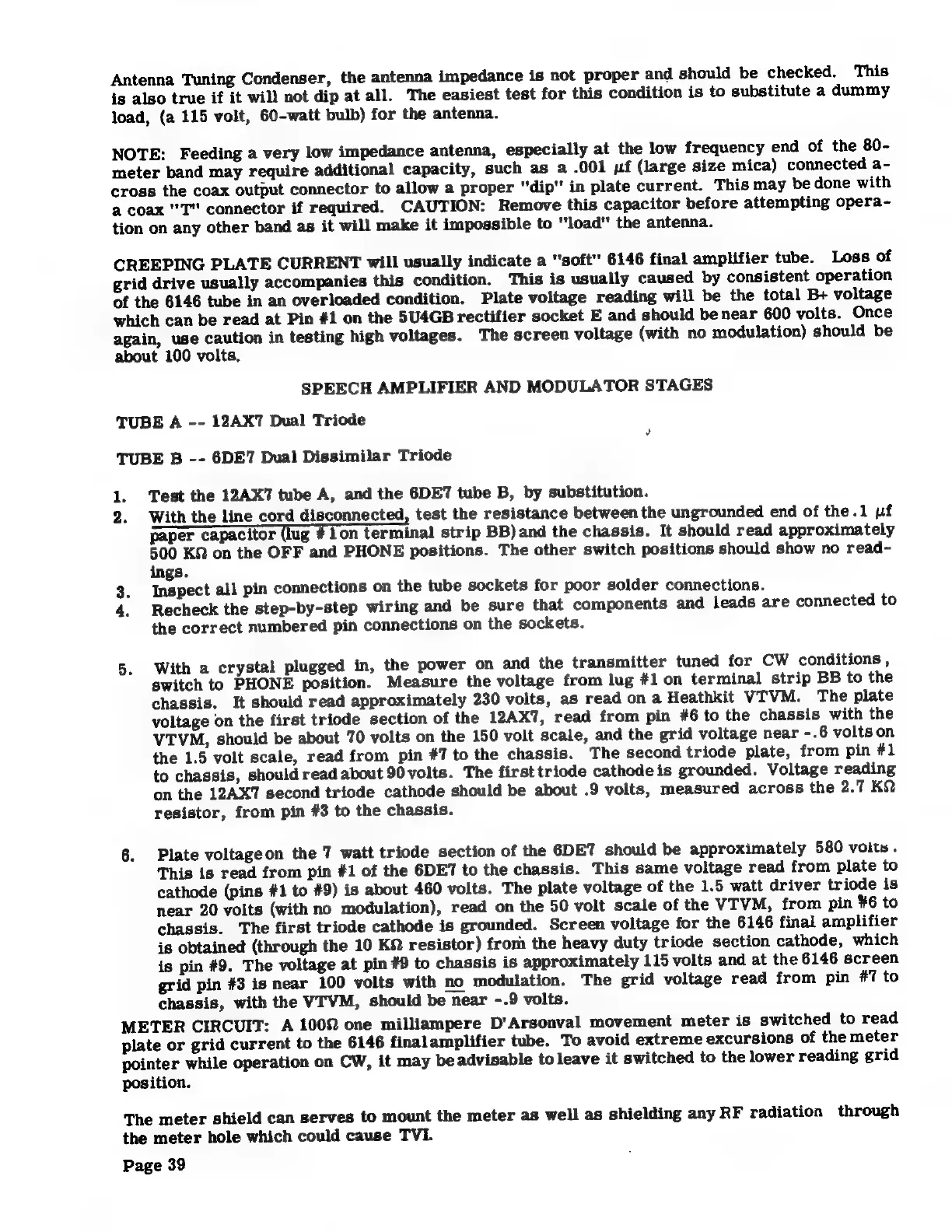 Heathkit DX-40 - SPEECH AMPLIFIER AND MODULATOR STAGES; Tube and Component Testing; Meter Circuit Analysis