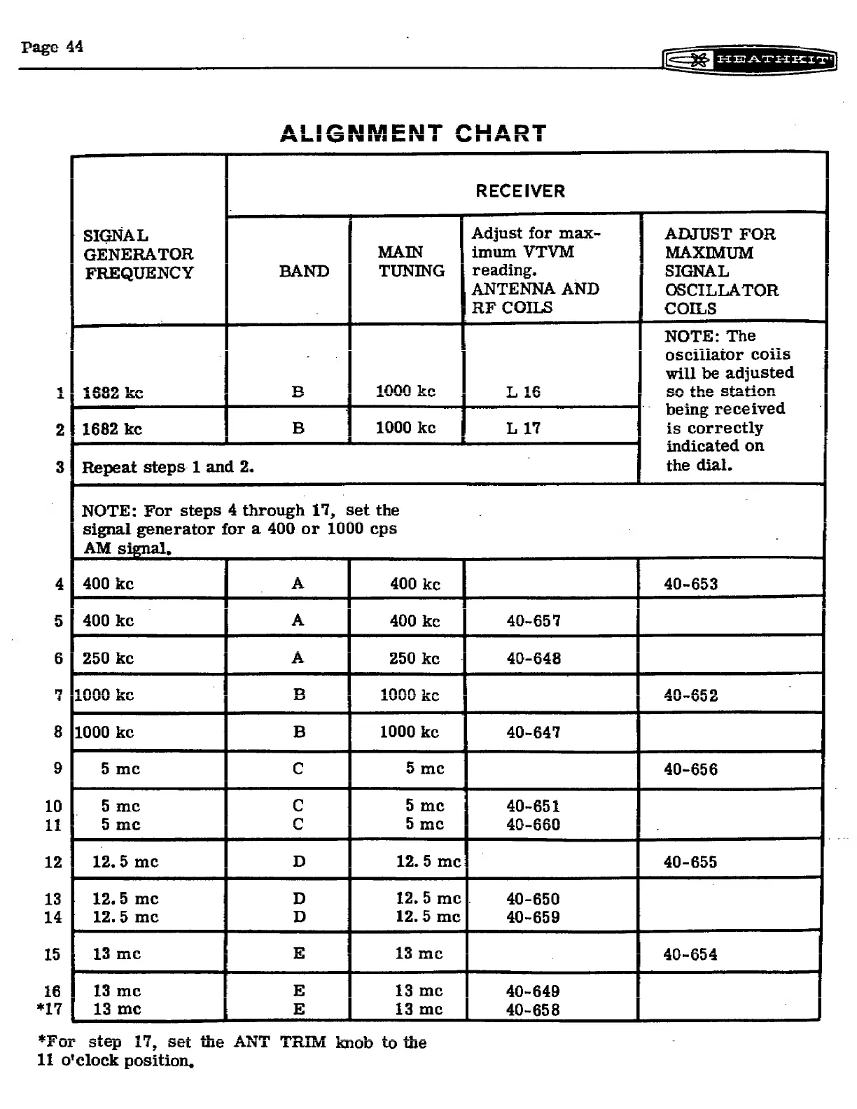 Heathkit GR-54 - Alignment Chart; Frequency and Coil Settings