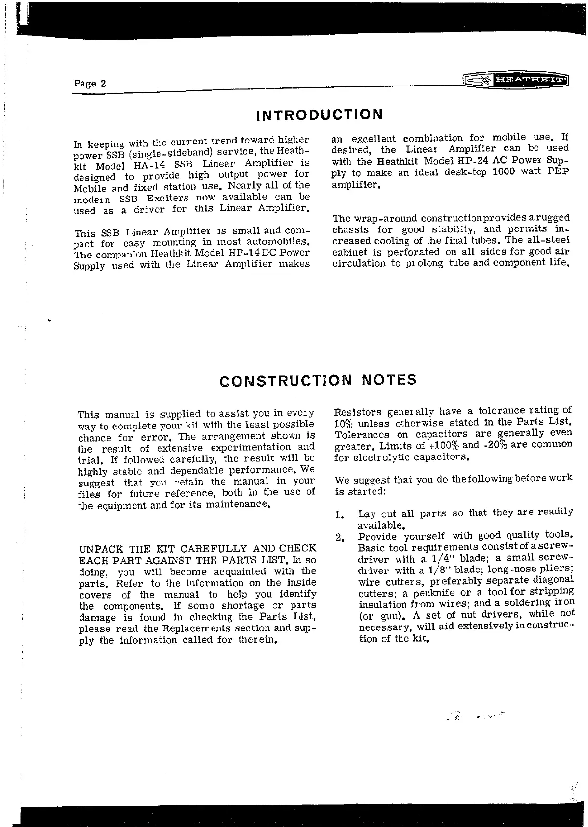 Heathkit HA-14 - Introduction to the SSB Linear Amplifier; Construction Notes and Tool Requirements
