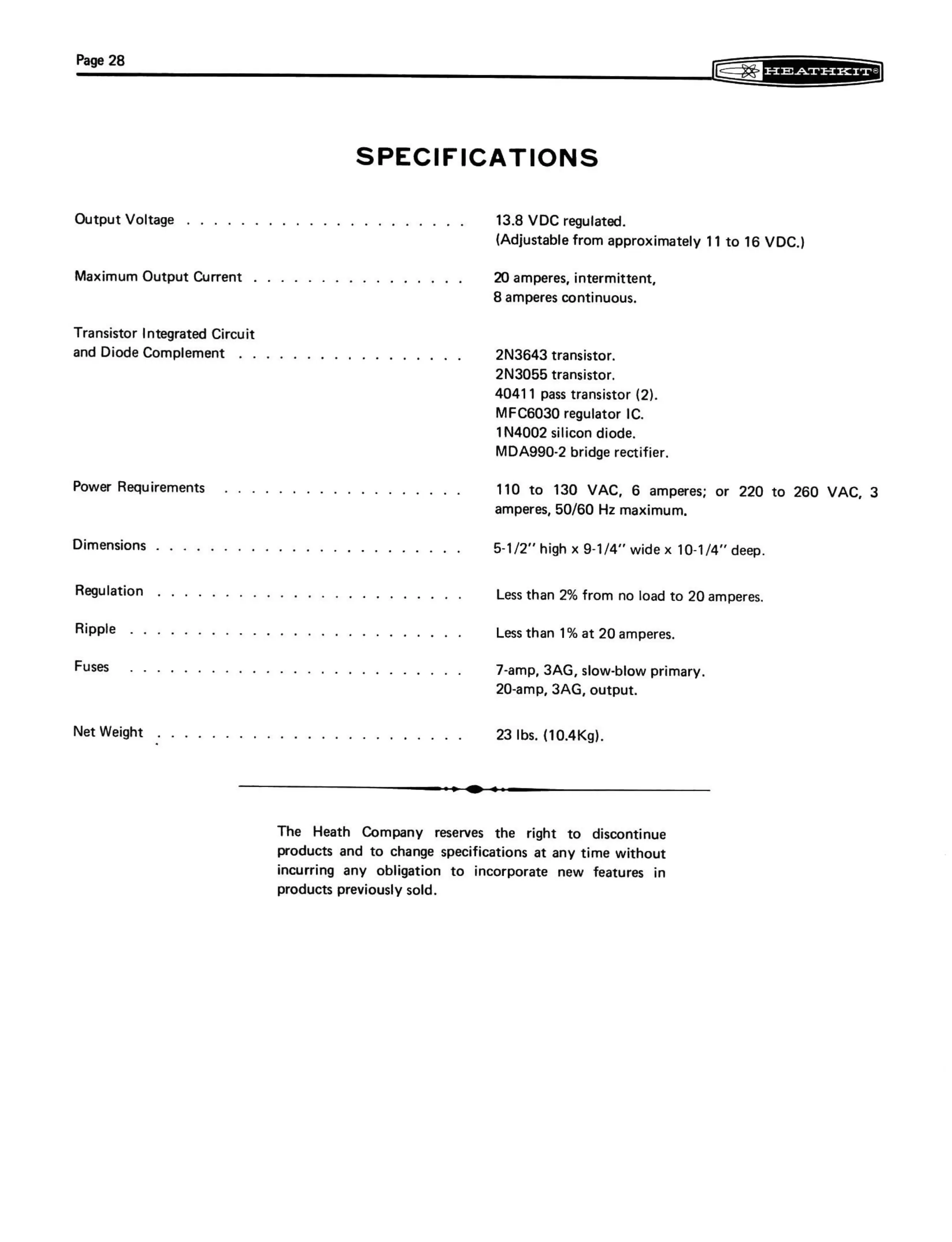 Heathkit HP-1144 - Heathkit AC Power Supply Specifications