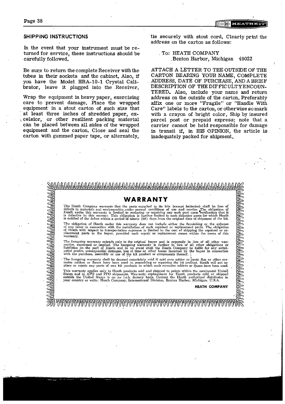 Heathkit HR-10B - Shipping Instructions; Warranty