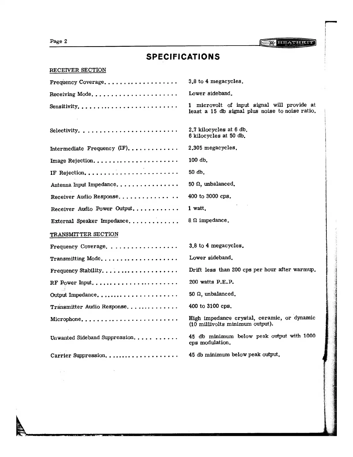 Heathkit HW-12 - Specifications; Receiver Section; Transmitter Section