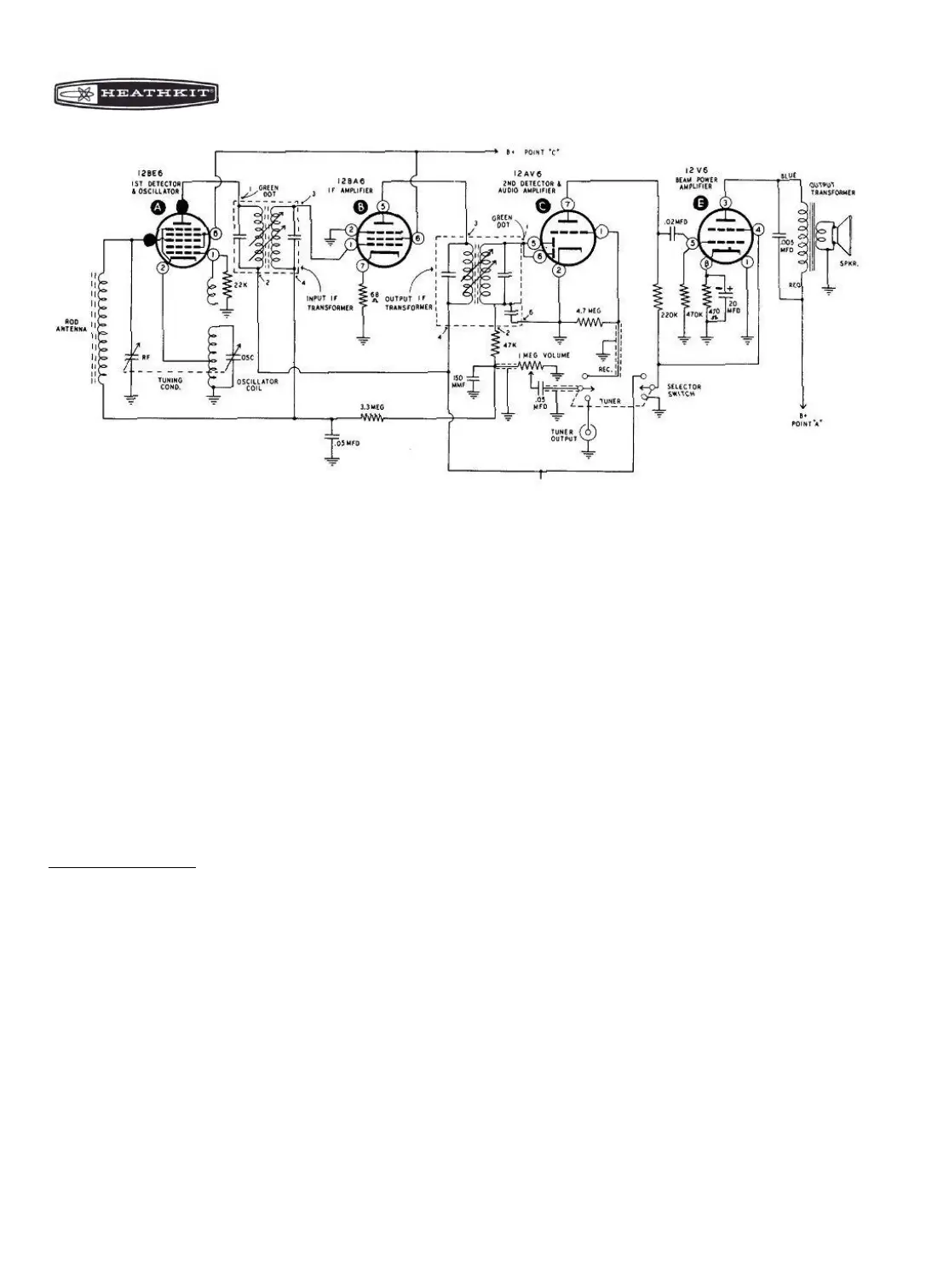 indicator tube and the speaker. From the detector stage (pin 5 and 6 of tube C) the signal can be traced through the various